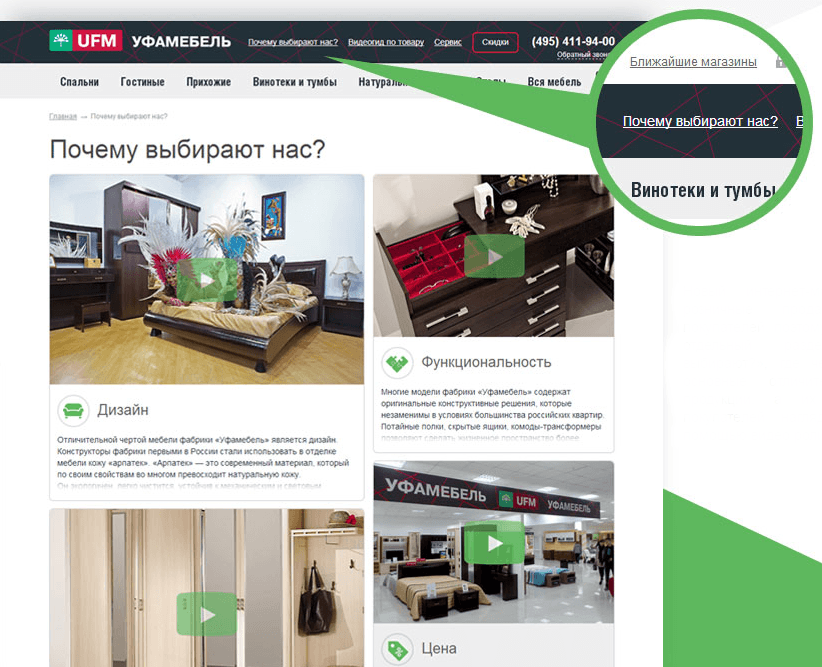 Сайт проектировался под розничного покупателя, поэтому отдельный раздел отведён под описание преимуществ компании. Здесь производитель честно делится плюсами и минусами своих товаров, наглядно показывает продукцию в видео роликах.