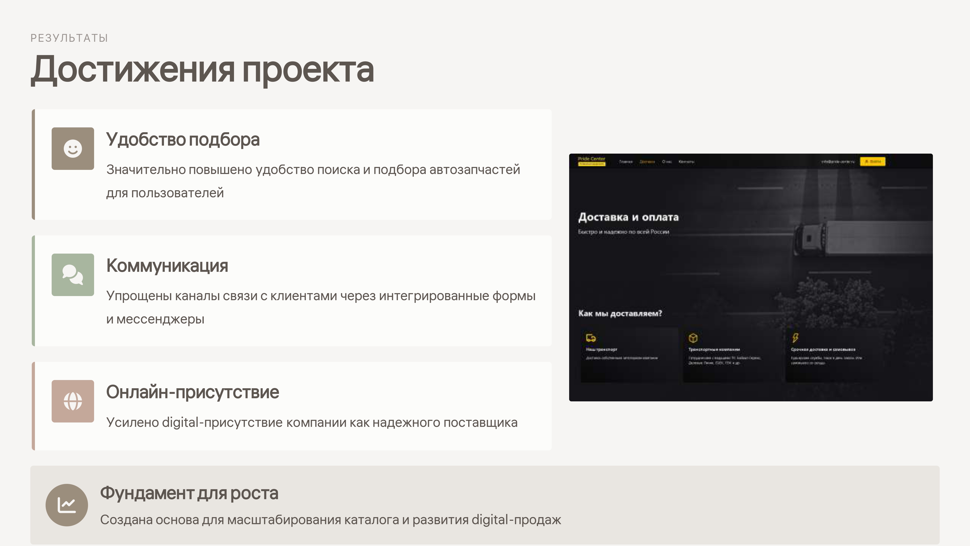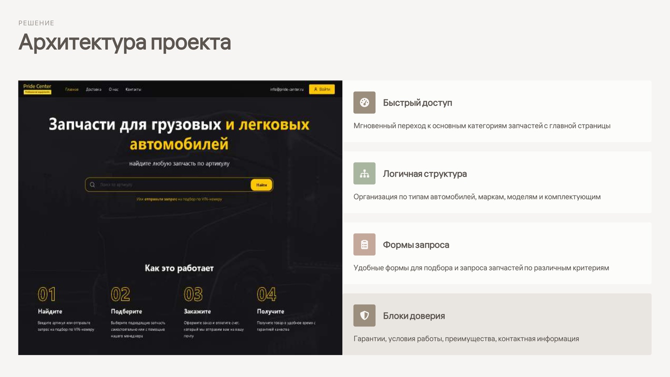 Мы разработали корпоративный сайт с элементами онлайн-каталога, ориентированный на специфику рынка автозапчастей и реальные сценарии пользователей: