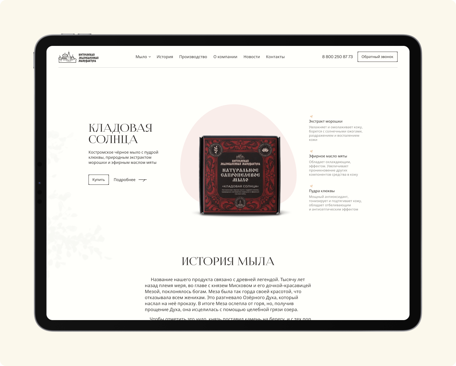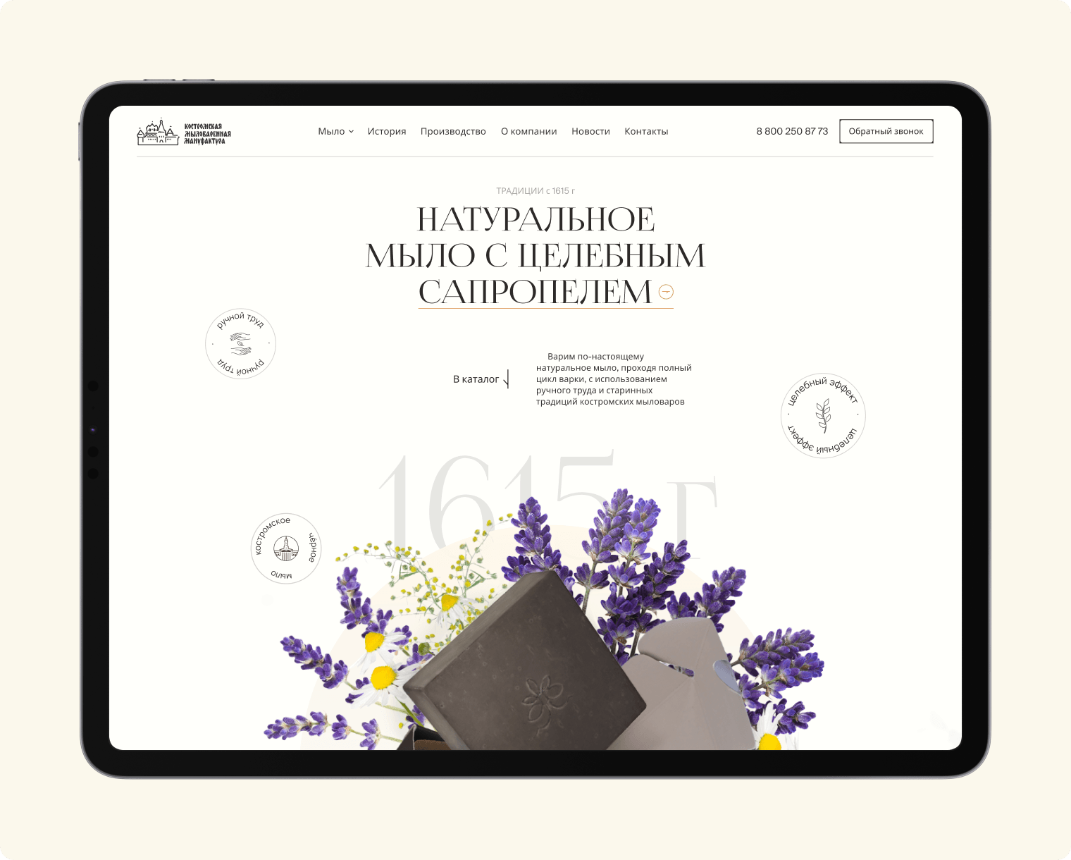 Мы разработали сайт для Костромской мыловаренной мануфактуры, которая создает уникальное натуральное мыло из сапропеля. Этот проект объединил глубокую историю мыловарения, ремесленные традиции и современные технологии.