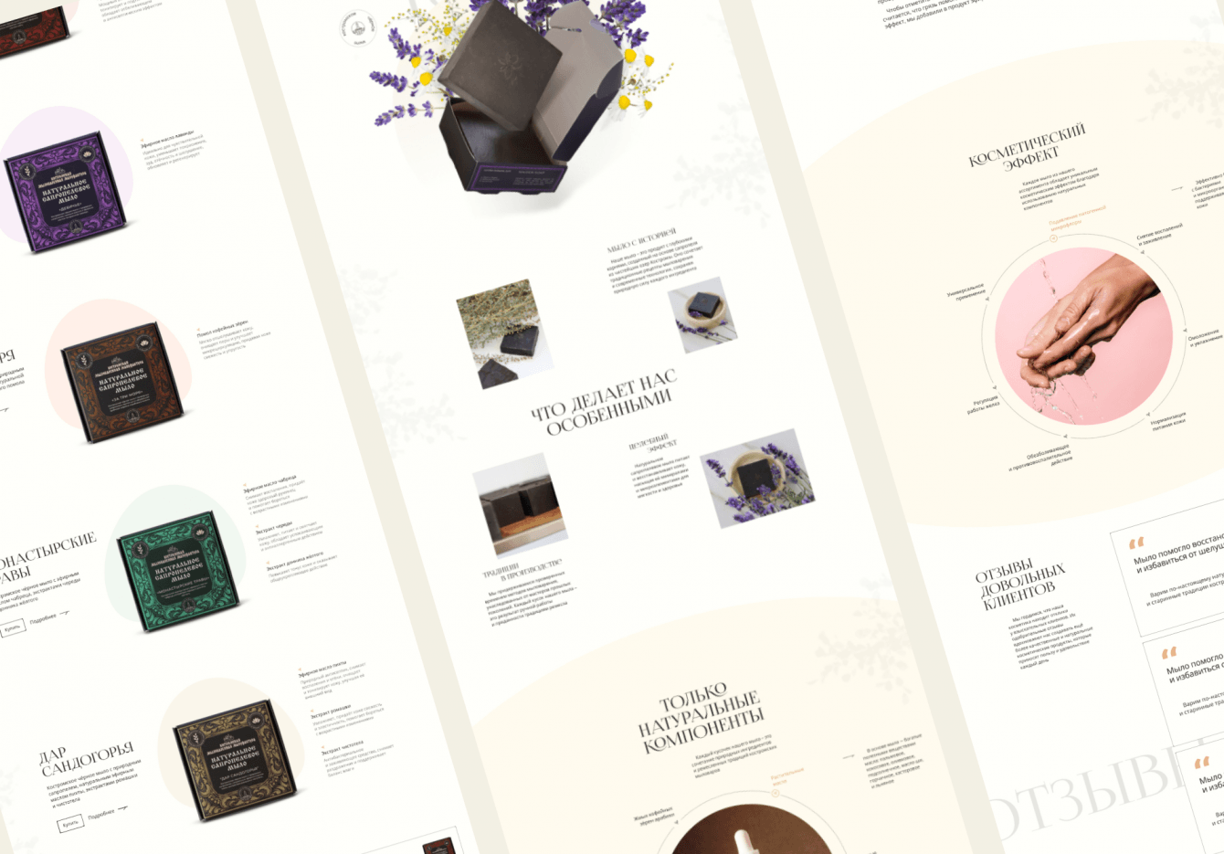 Главная страница сайта — самая насыщенная и информативная. Она включает информацию о составе мыла, описывает ценности компании, демонстрирует сертификаты качества, отзывы довольных клиентов и ответы на часто задаваемые вопросы. Каждый блок снабжен возможностью перейти к более подробному описанию, обеспечивая удобство и простоту навигации.