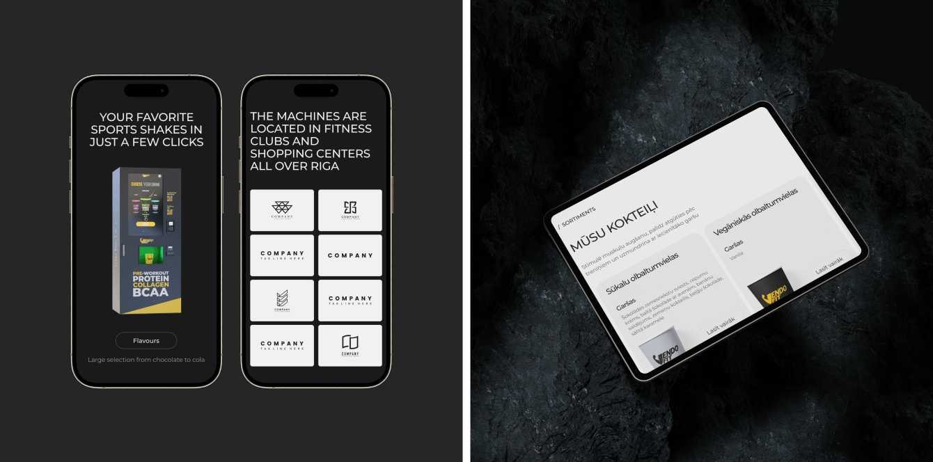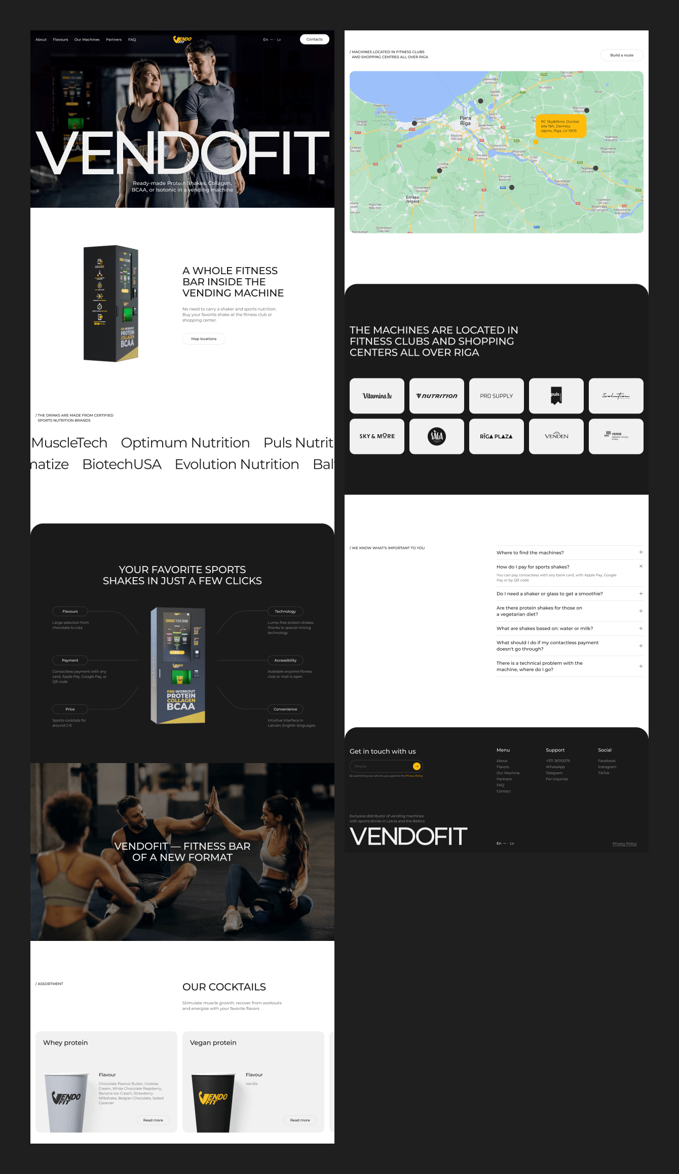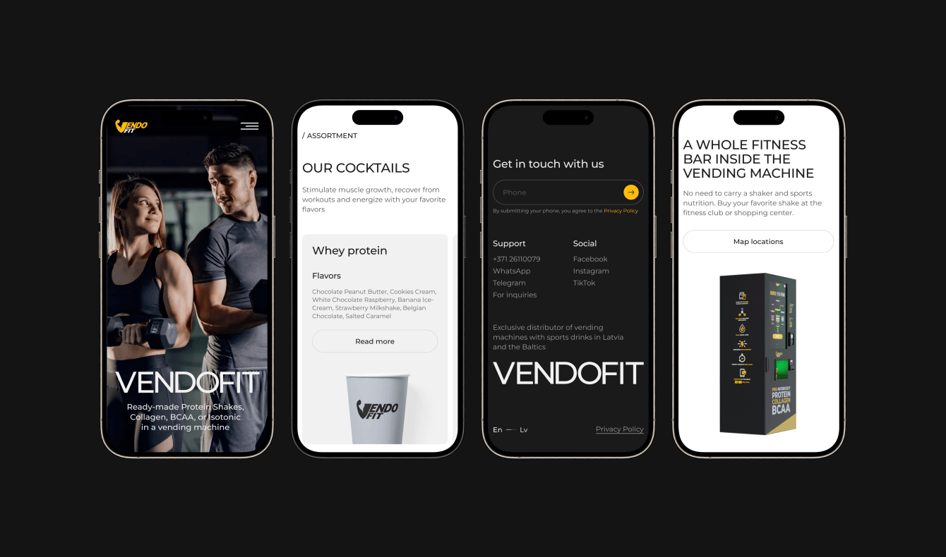 Vendofit — прогрессивный латвийский бренд, занимающий лидирующие позиции в установке вендинговых протеиновых автоматов для спортивных клубов и торговых центров. Наша задача состояла в создании современного и привлекательного лендинга на двух языках (английском и латышском).