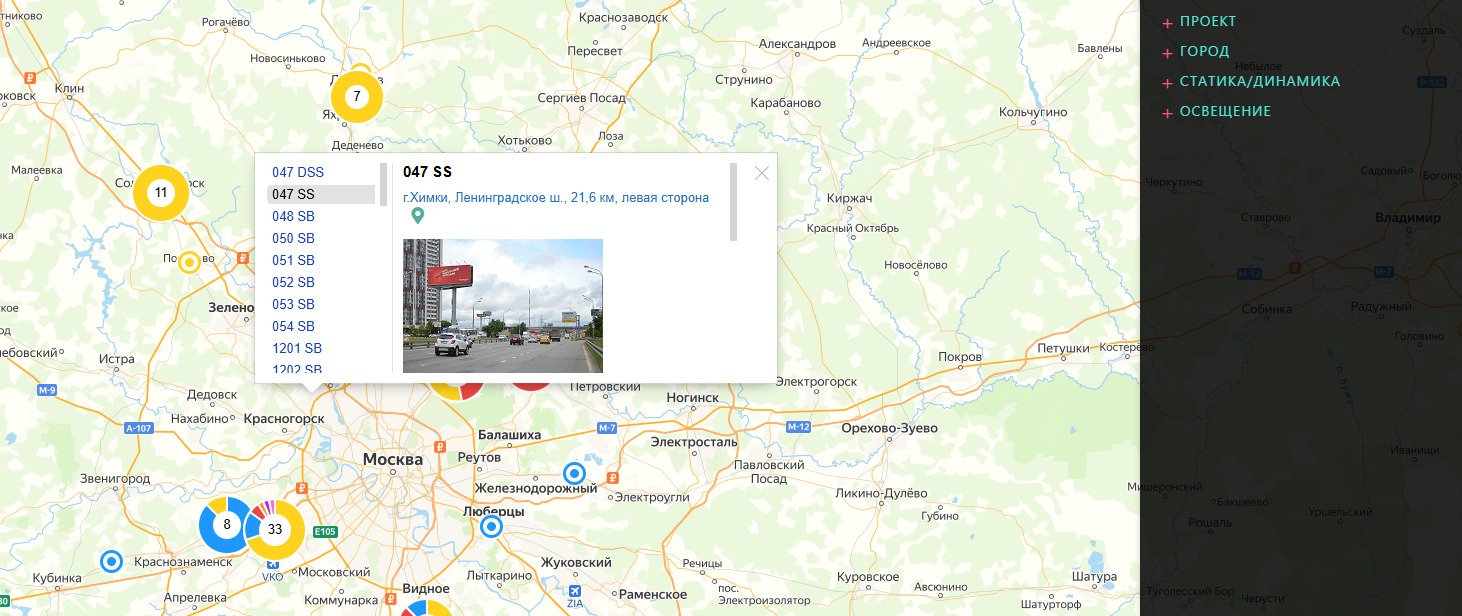 На Яндекс карту объекты выводятся по технологии balloons. У каждого типа носителей свои параметры - гео метка, адрес, картинки, функции освещения, динамики. Все эти свойства можно увидеть. кликнув на объект на карте.