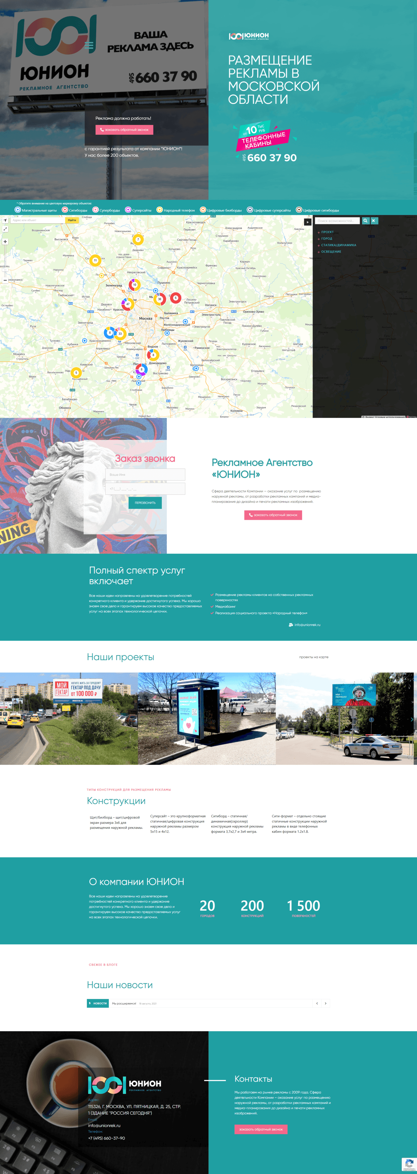 Требовалось создать современный сайт с полным перечнем услуг агентства, каталогом рекламных площадок, а главное - с выведением рекламных носителей на интерактивную карту Яндекс с возможностью их фильтрации.