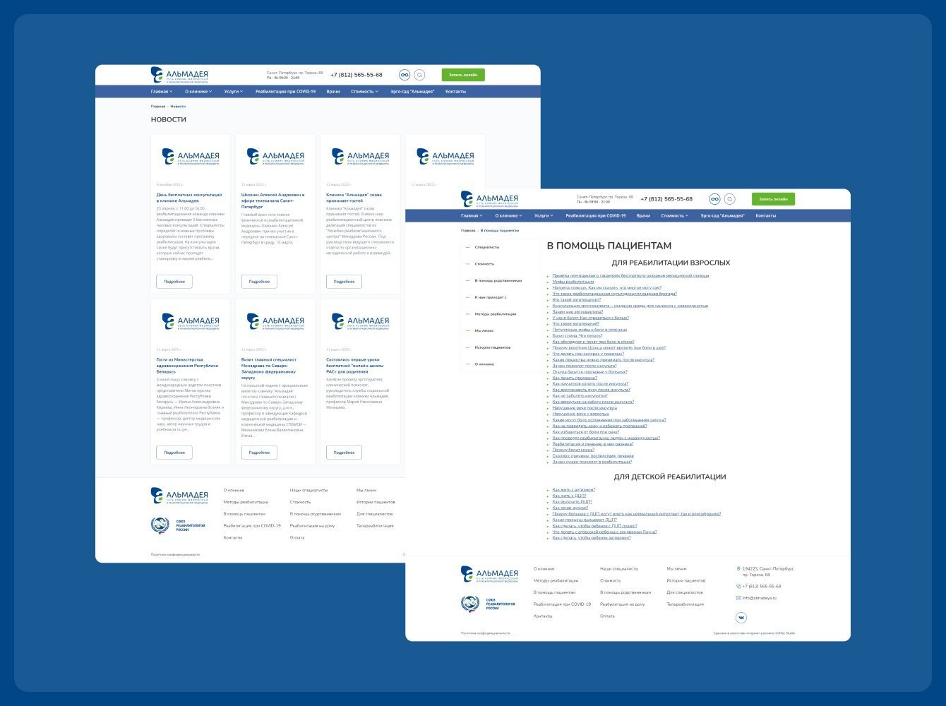 4. Тематика реабилитации имеет свои особенности. Это относится как к цветовым решениям на сайте (белый, синий, зеленый), шрифтам и расположению блоков, так и к контенту. Продавать "в лоб" было некорректно, поэтому формы обратной связи и баннеры внедрялись очень аккуратно.