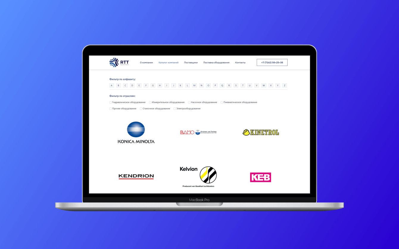 Создали каталог поставщиков промышленного оборудования, с которыми сотрудничает ТОО «РадиоТоргТехника» с фильтрами по отраслям и алфавиту. Для каждой компании подготовили информативные карточки с уникальными текстами, описывающими продукцию и ключевые преимущества.