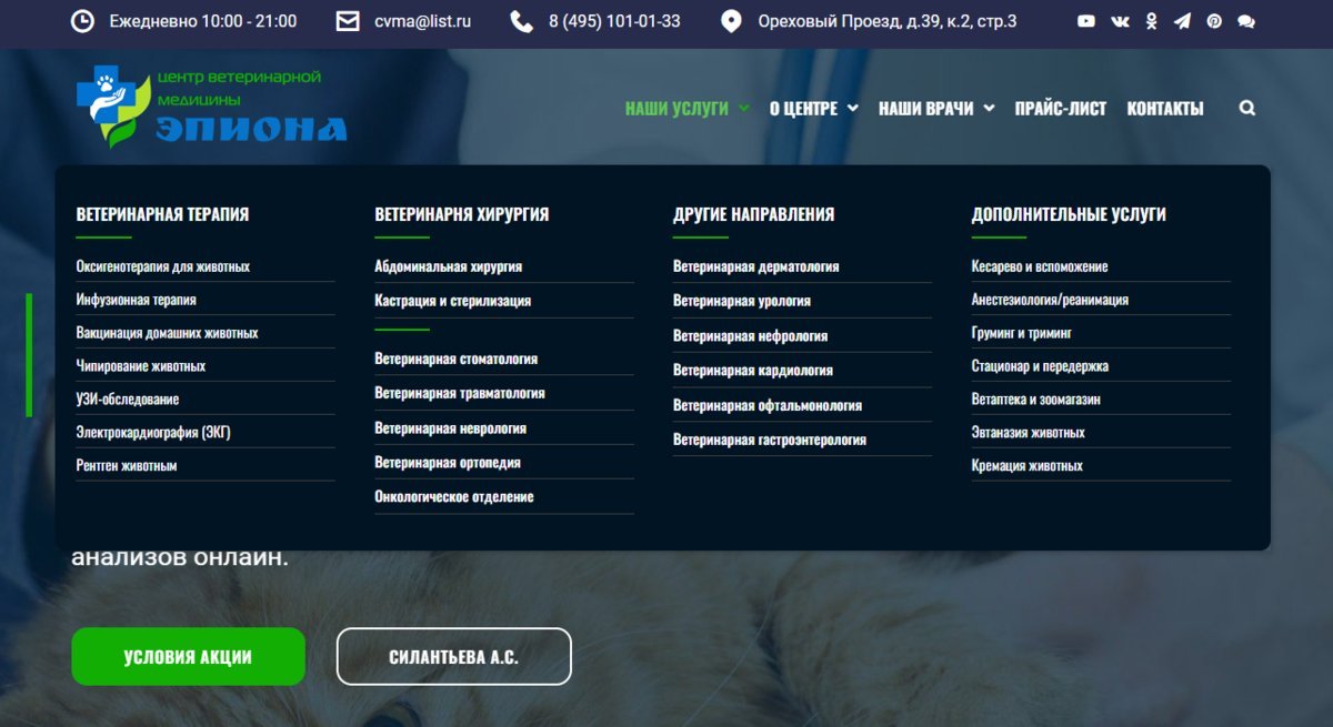 3. Продумывание размещения контента так, чтобы каждый элемент отвечал требованиям юзабилити и при этом помогал SEO-продвижению сайта и SMM-продвижению аккаунтов ветклиники.