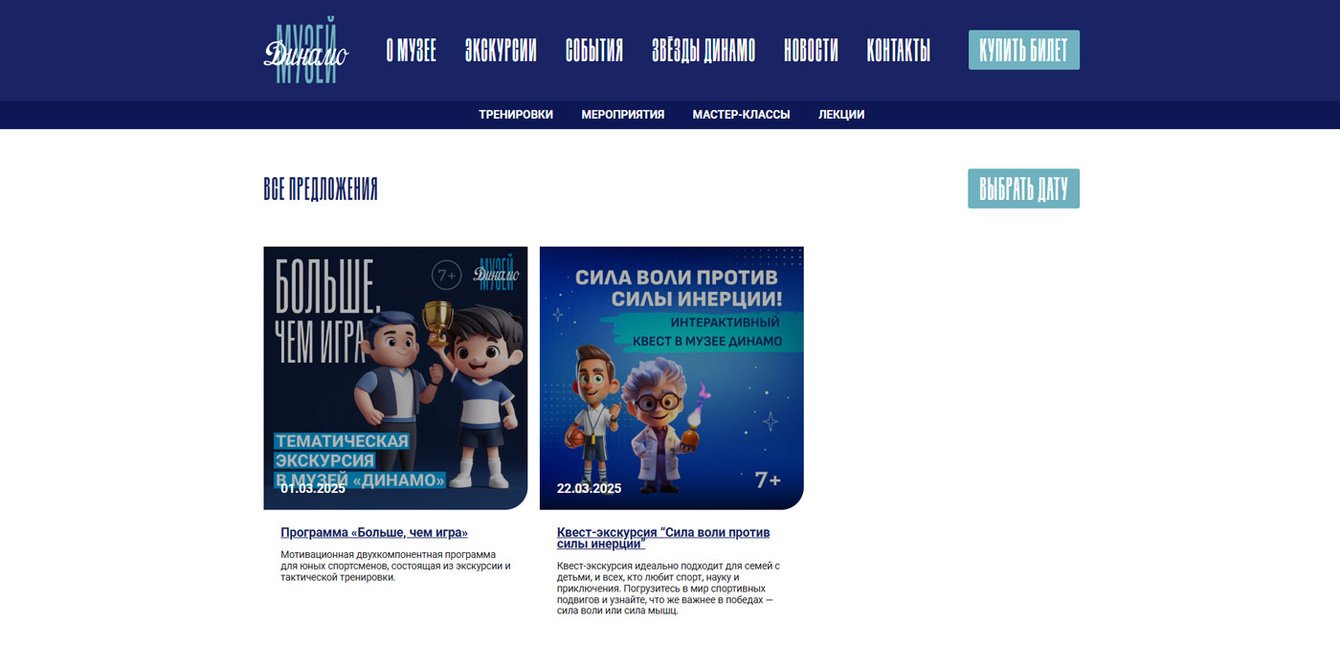 Предыдущий сайт "Музея "Динамо" был собран на неудобной для администрирования и развития CMS "Музей+", и Заказчик обратился к нам с просьбой пересобрать сайт Музея на более удобной и гибкой платформе.