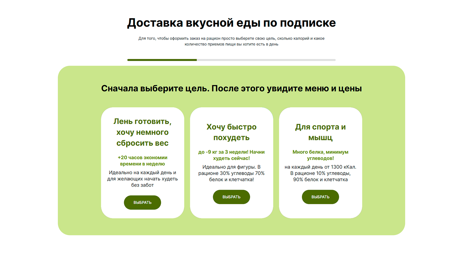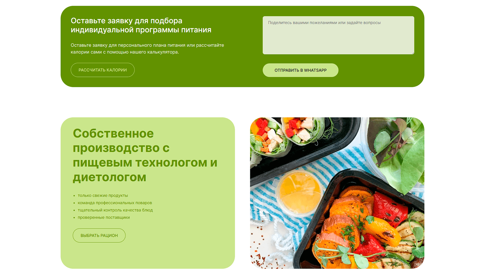 Создание полного лендинга и разделов подбора рациона: пользователь может выбрать цель, суточную норму калорий и количество приемов пищи, после чего видит персонализированное меню и цены.