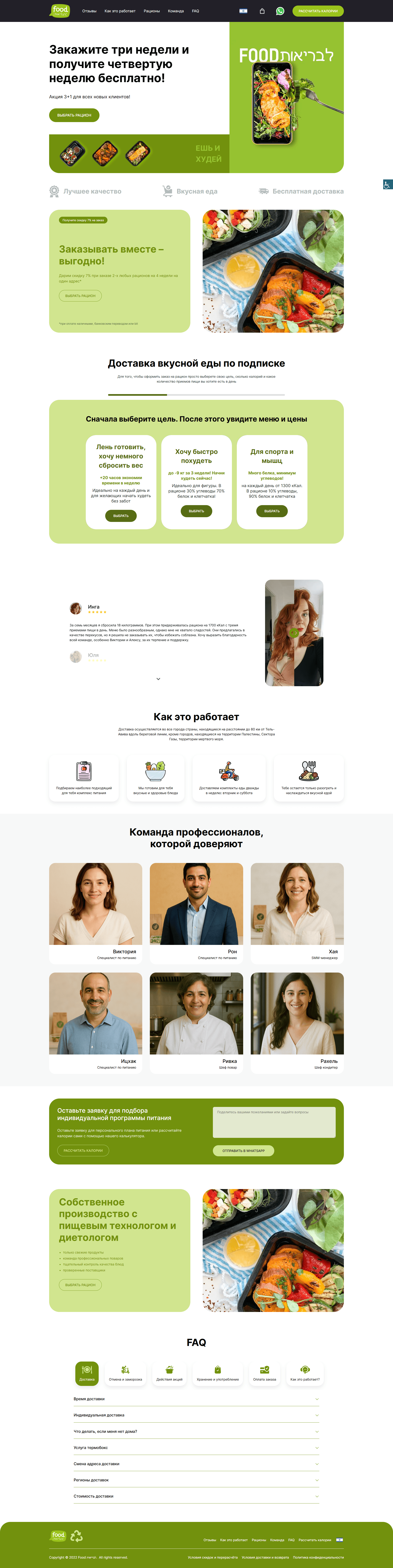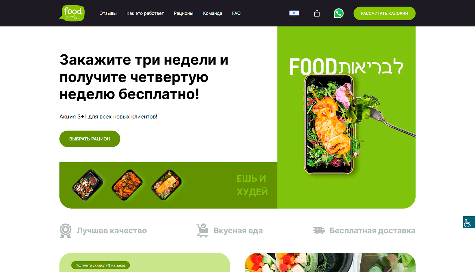 Backend и интеграции: WooCommerce + израильская платежная система, логика расчета калорий, управление акциями и заказами.