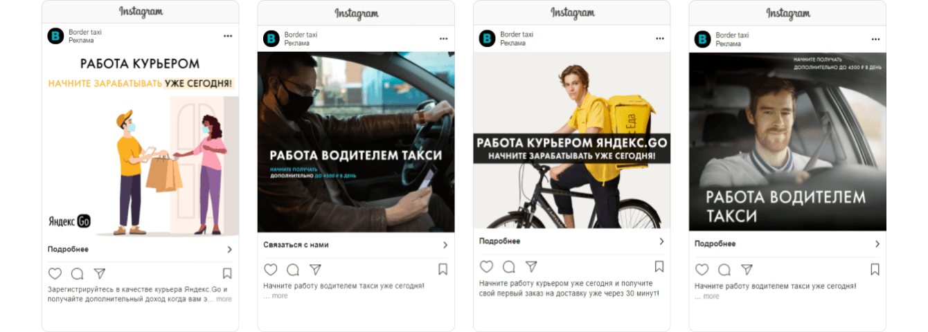 С точки зрения картинок мы сосредоточились на ярких форматах 1к1 и 16к9, на которых были изображены существующие водители и их автомобили.