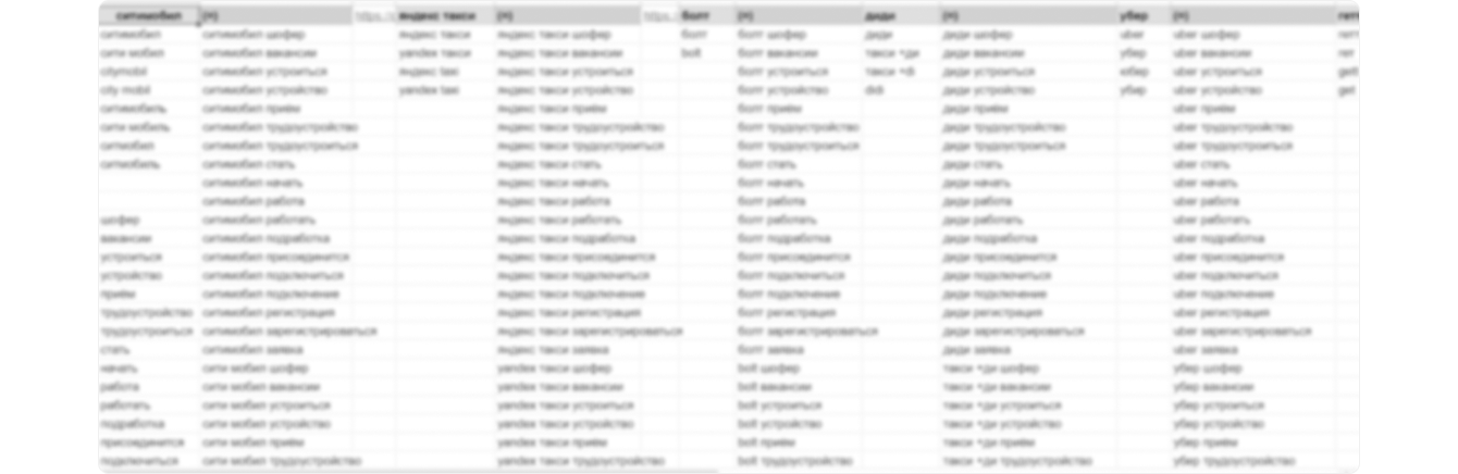 Для работы было собрано максимально широкое семантическое ядро, которое включало в себя перемножение любых словоформ названия Яндекс.Такси со словами, указывающими на намерение работать водителем: устроиться, подключиться, регистрация и их синонимы - всего было найдено порядка 35 таких слов.