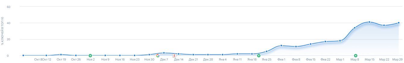 Процент ключей в ТОП-10 по итогам работы составил 40%: