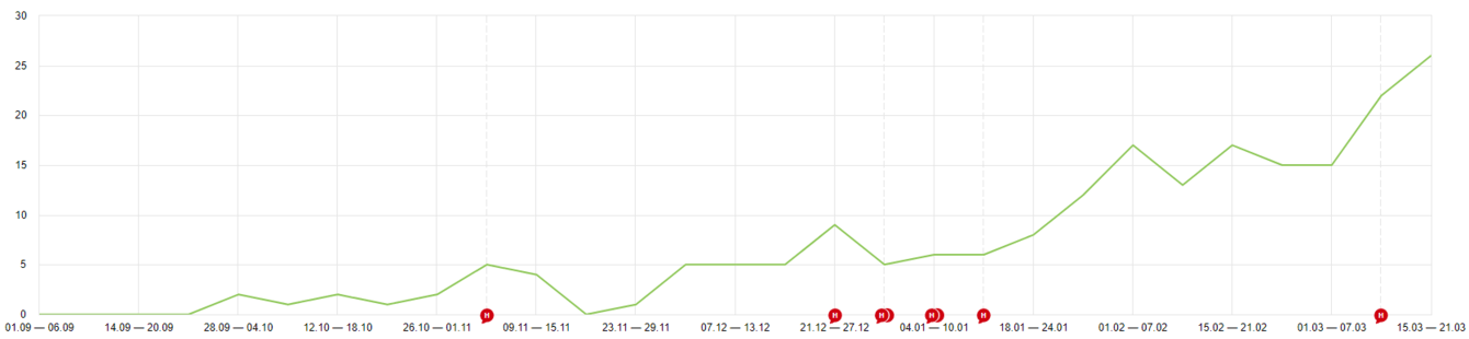 В начале работ трафик составлял 0 посетителей в неделю, а за 7 месяцев работы вырос до 30 визитов в неделю.