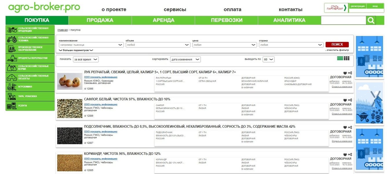 К нам обратился клиент с задачей разработать агропромышленный интернет-портал. Основным назначением Сайта являлось создание информационной площадки с предоставлением актуальной информации путем размещения объявлений о товарах и услугах данного сегмента для участников агропромышленного комплекса с целью их покупки/продажи/аренды/перевозки, что включает в себя: получение информации о ценах, характеристиках товаров и услуг, наличии, условиях оплаты, местонахождении и прочих условиях покупки/продажи/аренды/перевозки посредством сети Интернет.