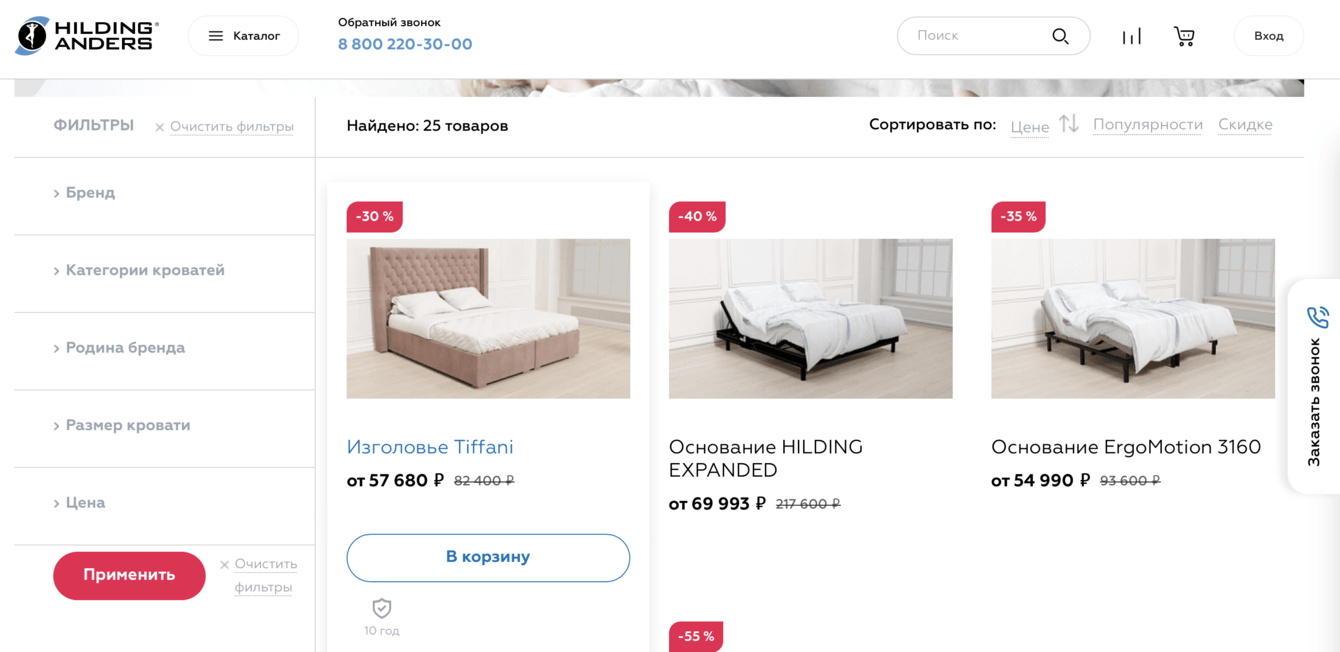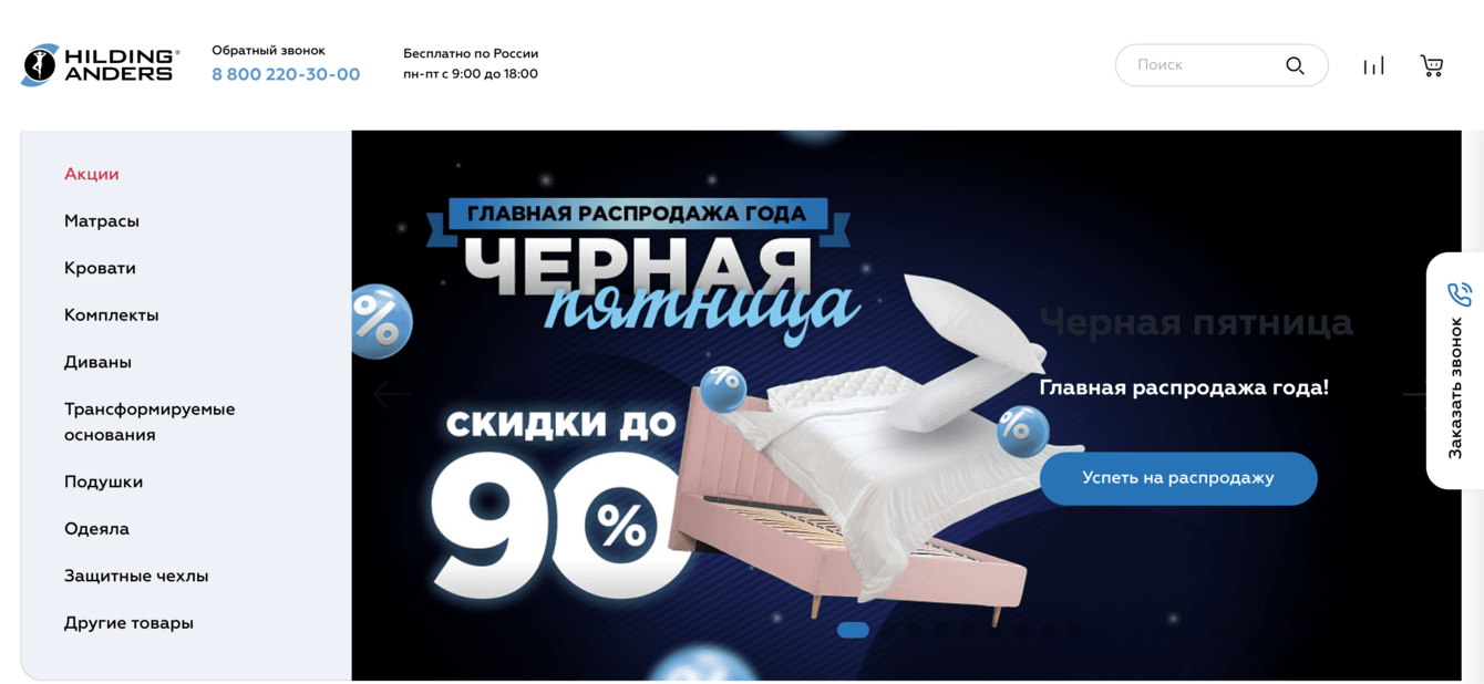ООО «Хилдинг Андерс Рус» выражает свою искреннюю благодарность компании “42Solution” за плодотворную работу. Мы обратились в “42Solution” для создания нашего интернет-магазина hilding-anders.ru. Была произведена большая работа по разработке уникального функционала, которая выполнена на профессиональном уровне с высоким качеством и в оговоренные сроки. Благодаря специалистам компании на сайте заработал конфигуратор кроватей со смарт-фильтрами и “умным” заполнением карточки товара, что стало основной функциональной особенностью нашего интернет-магазина. Покупатель может буквально “собрать” кровать, отфильтровав ее составляющие - ножки, декор, текстиль, основание. Также мы получили электронный прайс, который полностью автоматизировал процесс обновления цен на сайте. С этой кастомной разработкой прайс-лист можно просто загрузить в систему интернет-магазина, поставить дату обновления и новые цены загрузятся автоматически.