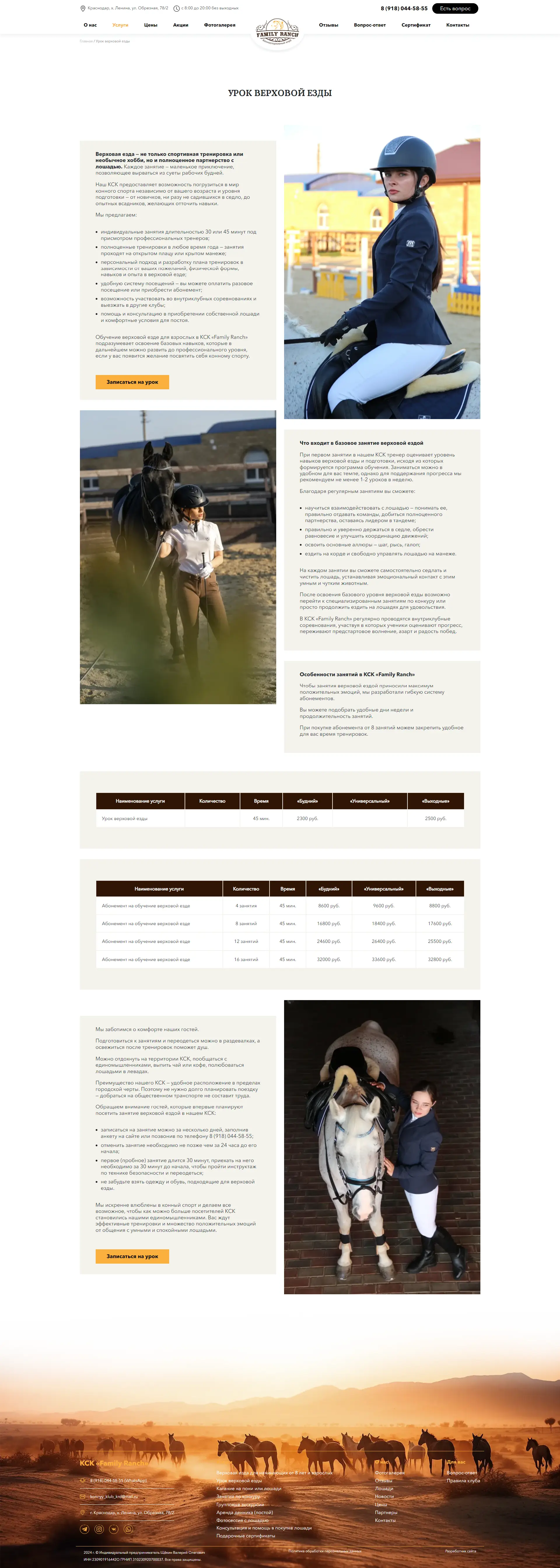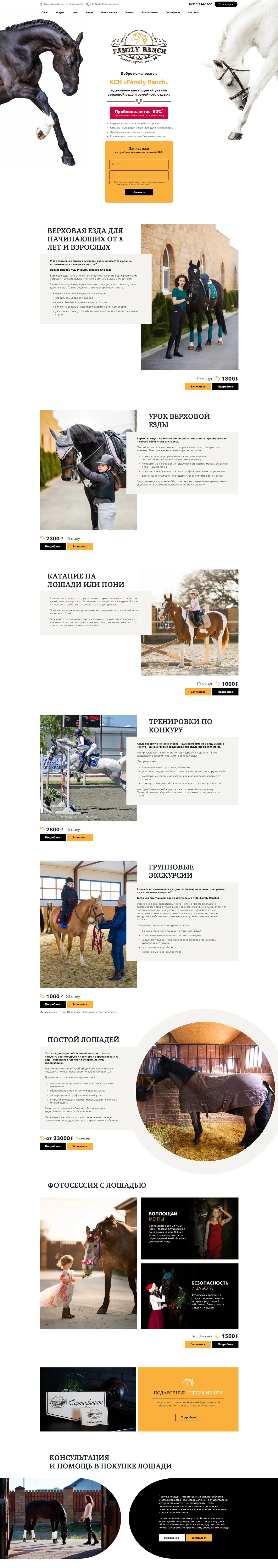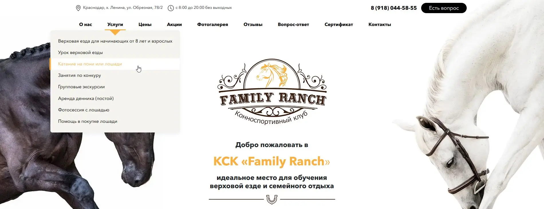 Основная задача проекта — презентовать КСК «Family Ranch», рассказать об услугах и правилах конноспортивного клуба, сделать сайт привлекательным для потенциальных клиентов.