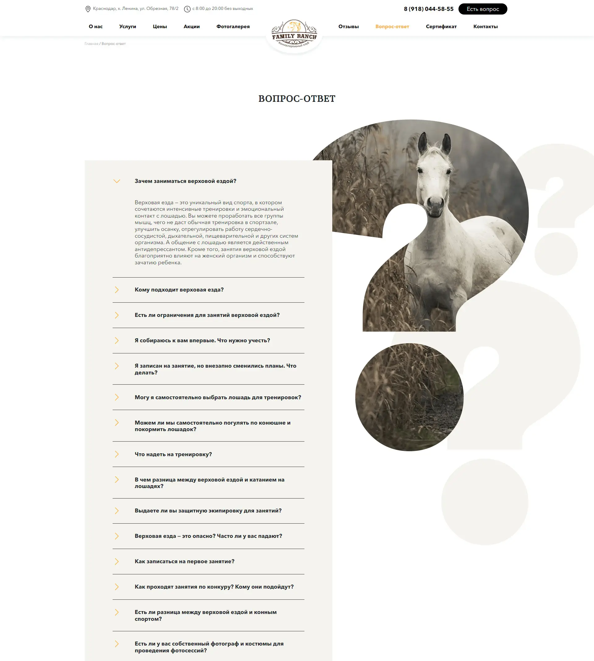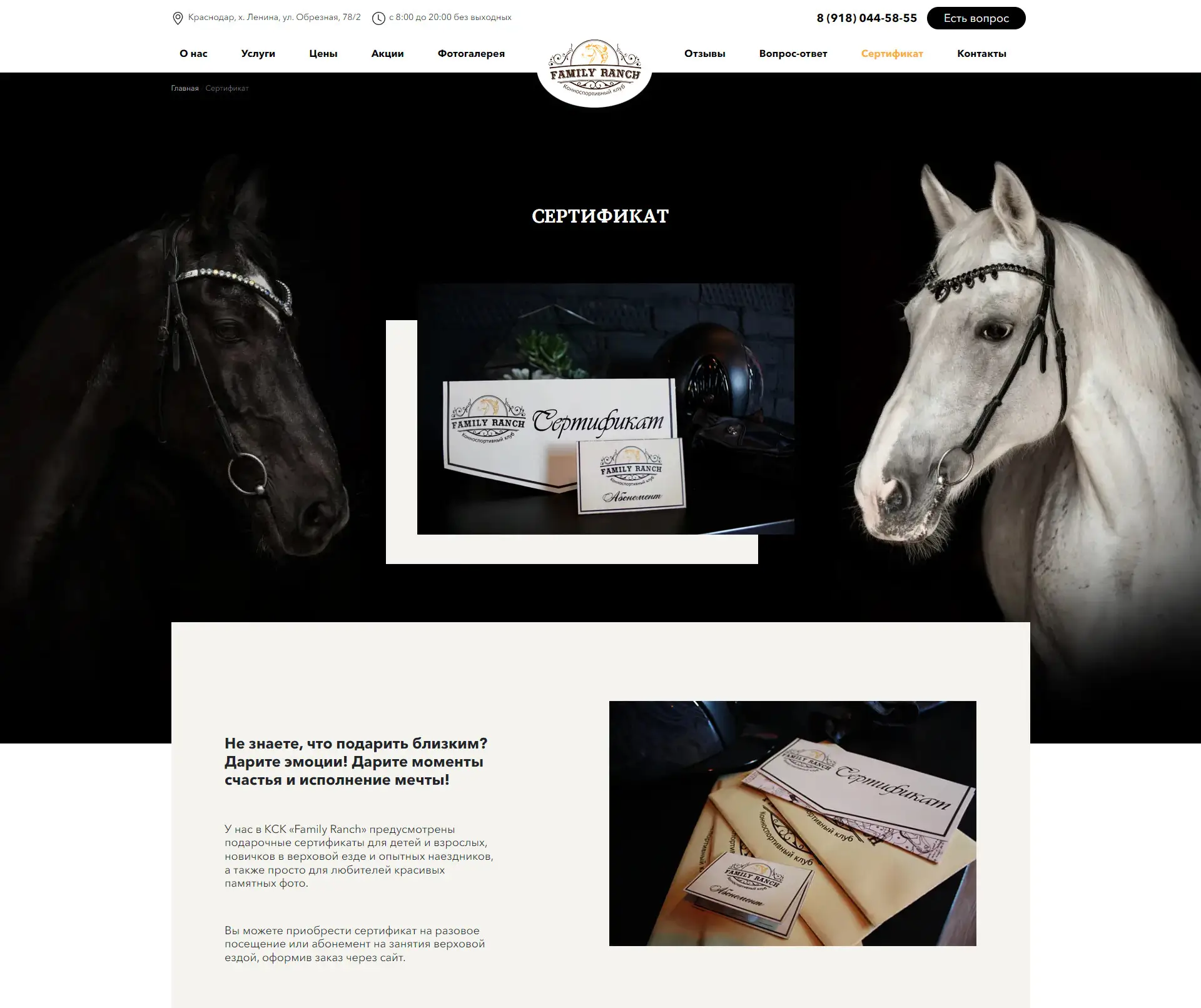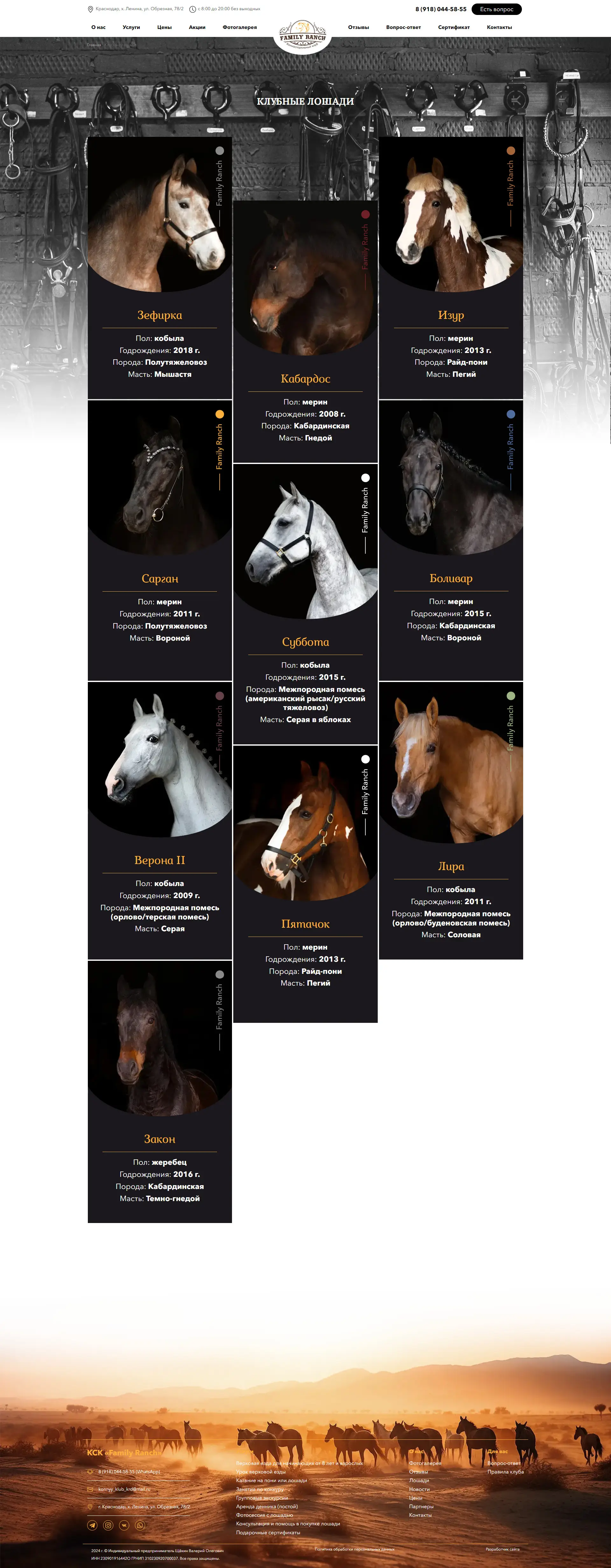 Основная задача проекта — презентовать КСК «Family Ranch», рассказать об услугах и правилах конноспортивного клуба, сделать сайт привлекательным для потенциальных клиентов.