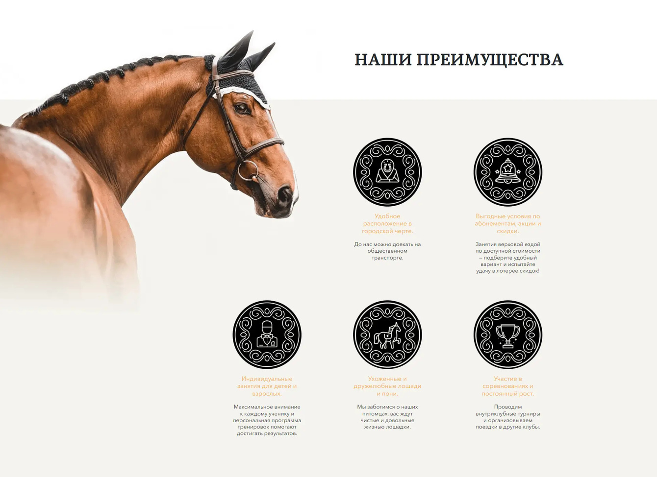 Для разработки сайта использованы фотографии территории конноспортивного клуба, клубных лошадей, тренеров и учеников.