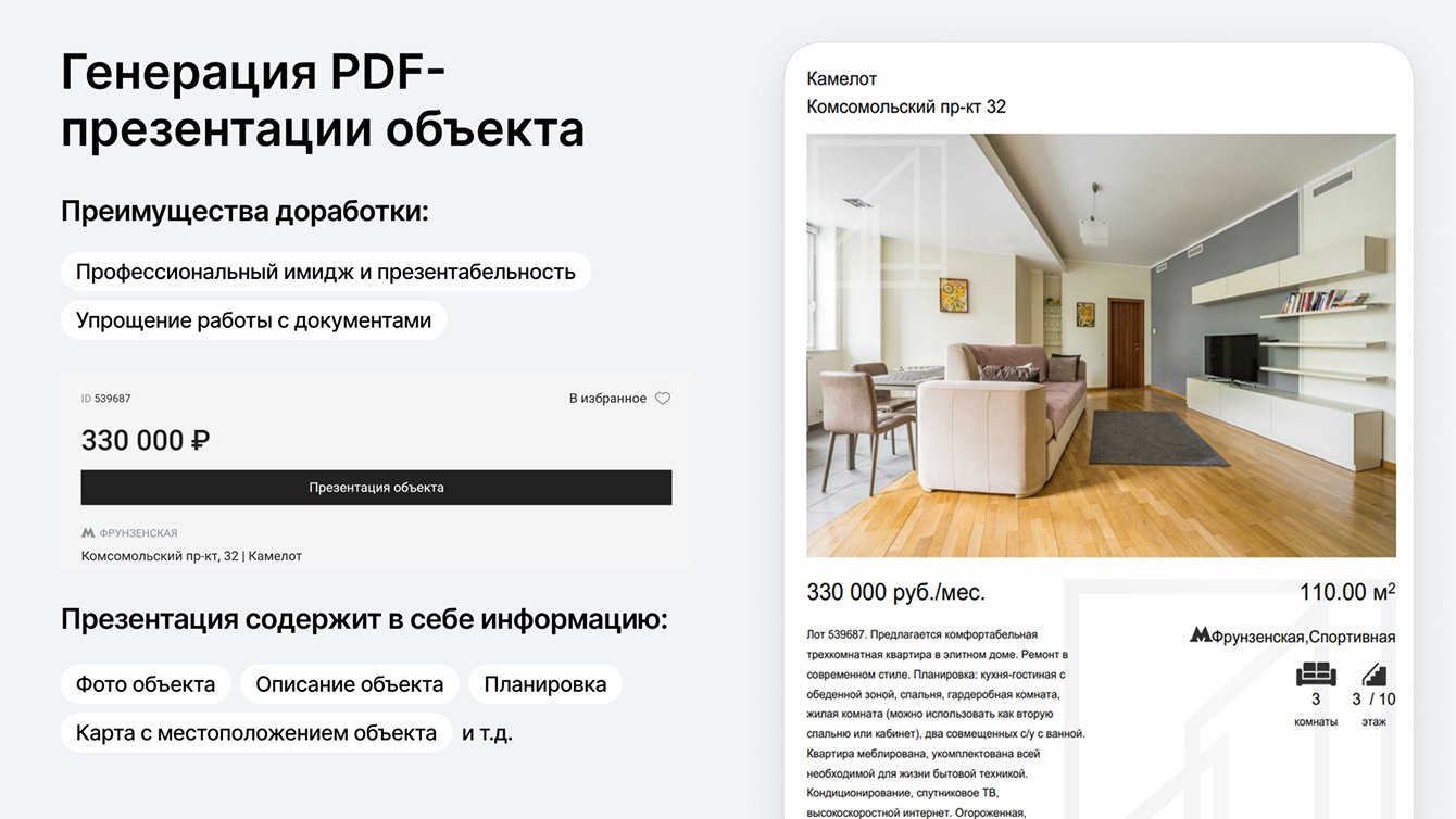 PDF-презентация позволяет пользователю сохранить информацию о недвижимости для дальнейшего просмотра или отправки коллегам и партнерам. Это особенно удобно, если клиент хочет сравнить несколько объектов или поделиться предложением с семьей и друзьями.