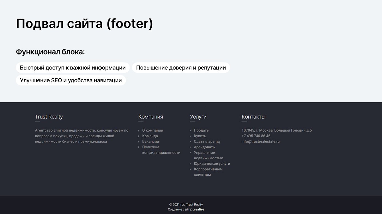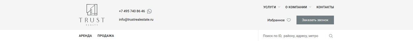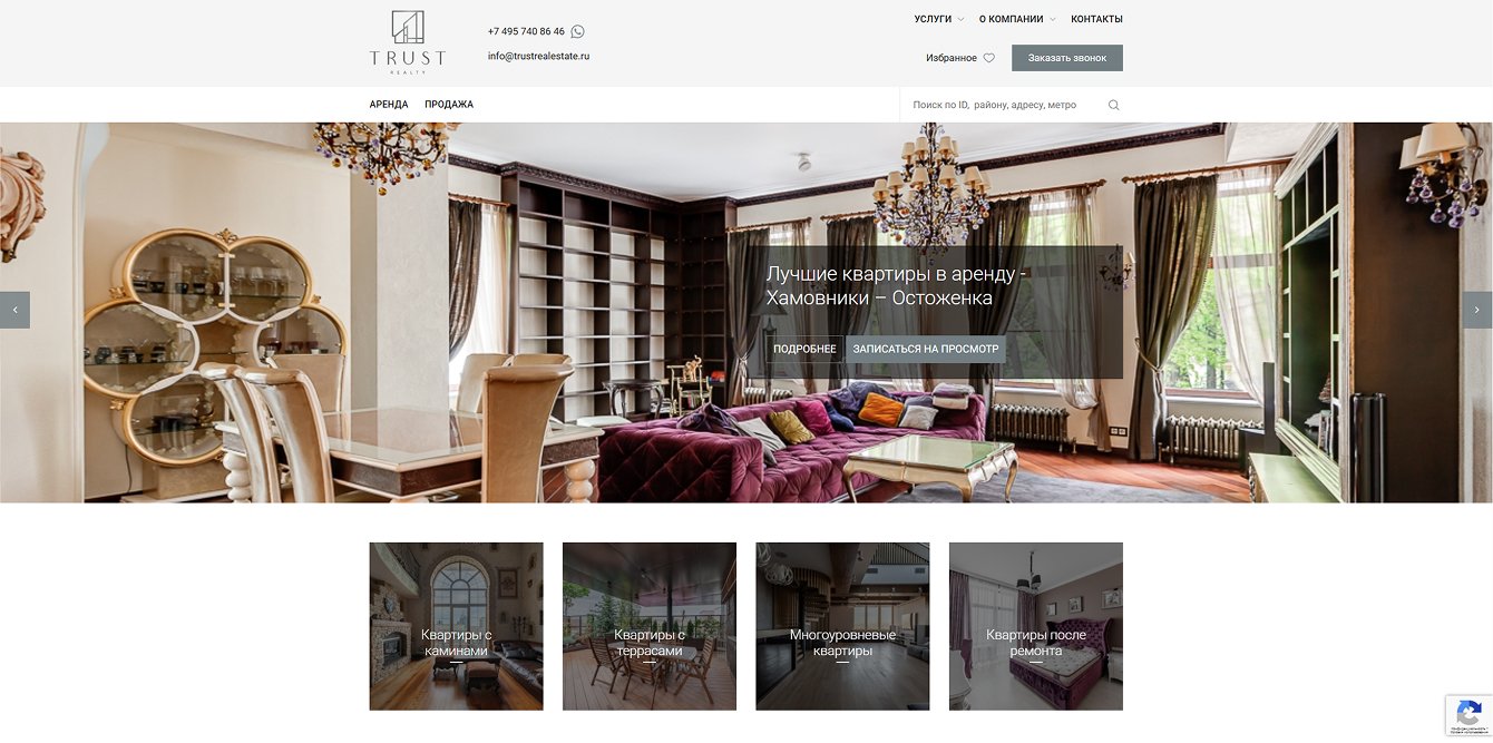Главная страница сайта Trust Realty выполнена в сдержанной и элегантной цветовой гамме, что соответствует позиционированию компании как агентства элитной недвижимости. Основными цветами дизайна являются белый, черный и серый, что подчеркивает профессионализм и надежность компании. Такие цвета часто используются в сфере недвижимости для создания ощущения элегантности и изысканности.