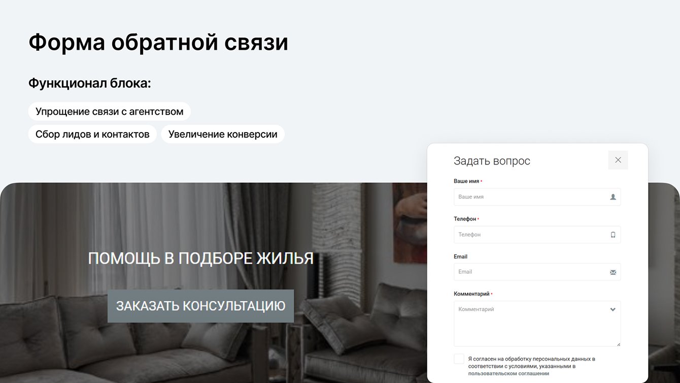 Предлагается помощь в подборе жилья с возможностью заказать консультацию, заполнив простую форму с полями для имени и телефона.