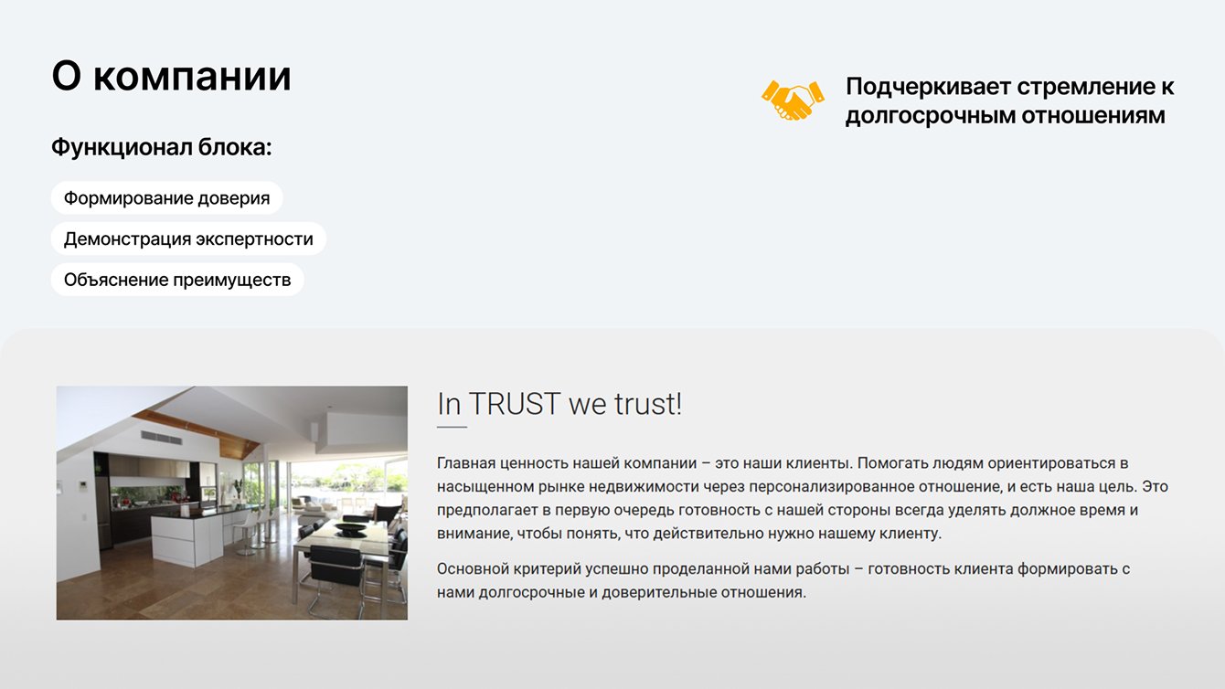 Краткое описание миссии и ценностей компании Trust Real Estate, подчеркивающее ориентацию на клиента и стремление к долгосрочным отношениям.