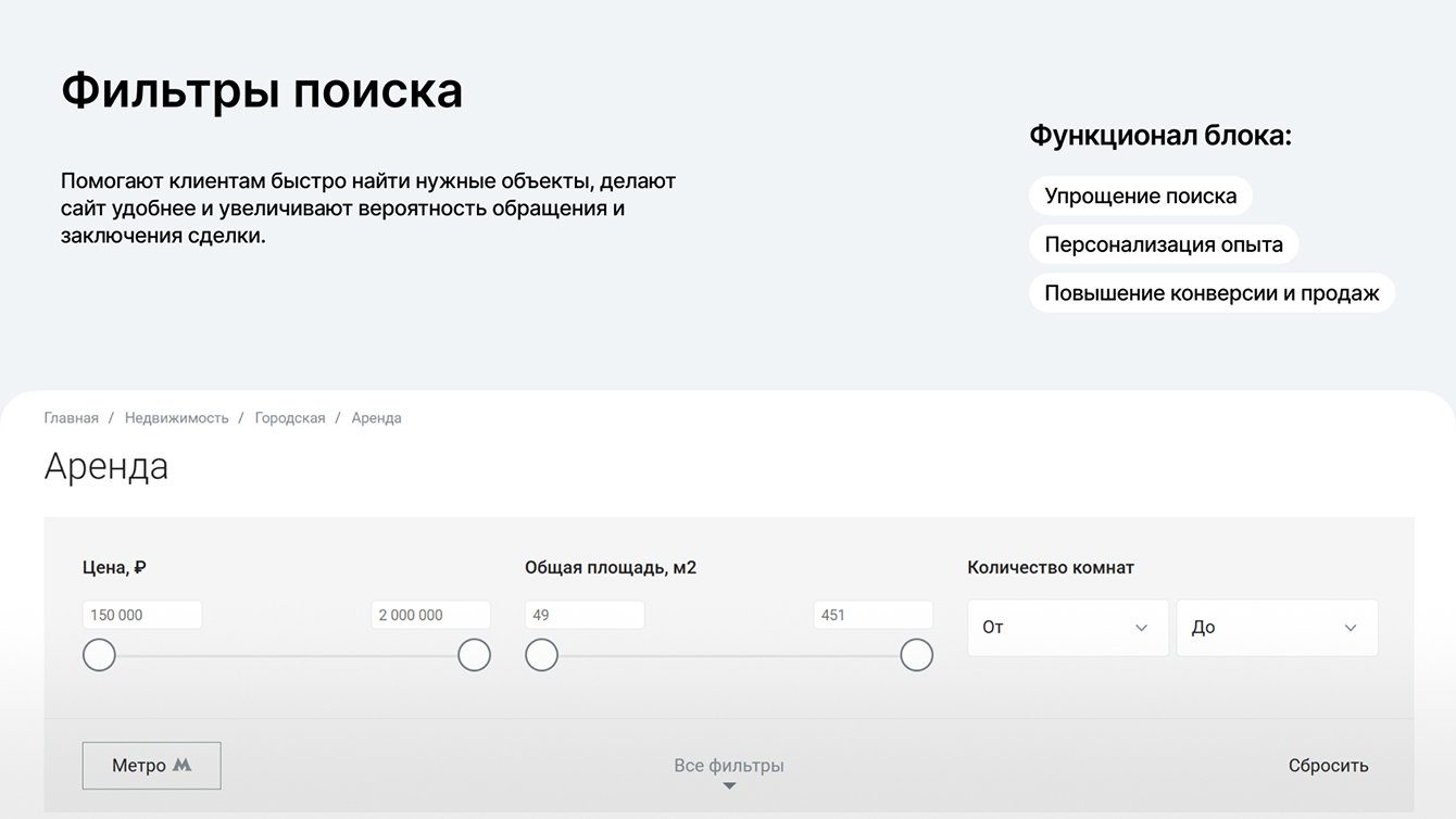 Для многих людей доступность метро является одним из главных факторов при выборе жилья. Фильтрация по станции метро помогает клиентам быстро найти объекты рядом с удобным для них транспортом, что значительно ускоряет процесс поиска.