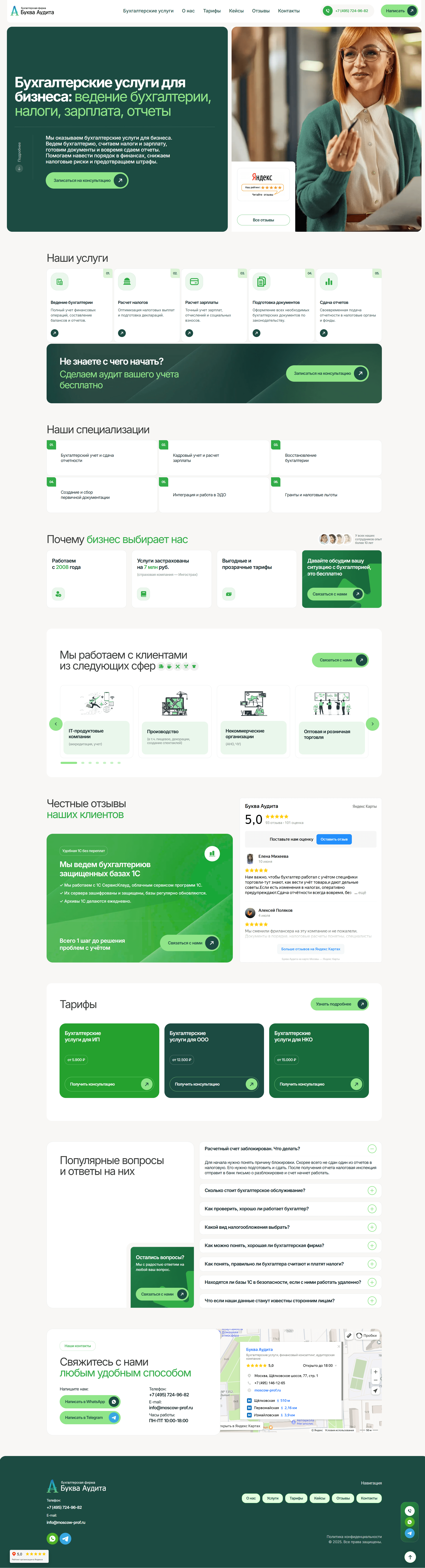 Цветовая палитра: зелёный (доверие, стабильность), белый (чистота), тёмно-зелёный (профессионализм).