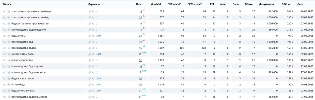 На данном скриншоте особое внимание стоит обратить на колонку "CPC", по ней мы ориентировочно можем понять сколько стоил бы один клик в контекстной рекламе, например, по запросу "Контрактное производство бадов" - 263 рубля, однако, после создания оптимизированного сайта, клиент может получать неограниченное количество кликов бесплатно!