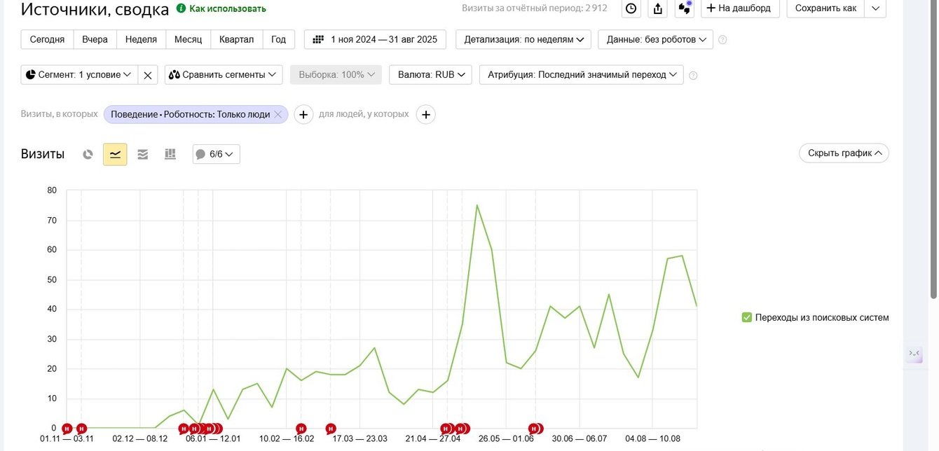 Как мы видим после создания сайта с нуля и выхода страниц в индексацию, трафик постепенно начал расти.