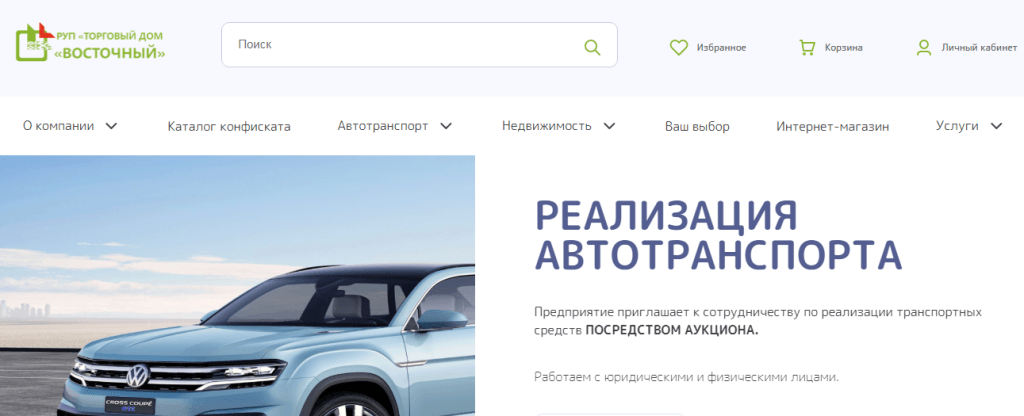ТД «Восточный» предлагает реализацию имущества через интернет-магазин. Сайт позволяет пользователям изучать ассортимент товаров, делать заказы и узнавать о наличии продукции в розничных магазинах «Ваш выбор». Также на сайте можно участвовать в аукционах по продаже автомобилей и недвижимости.