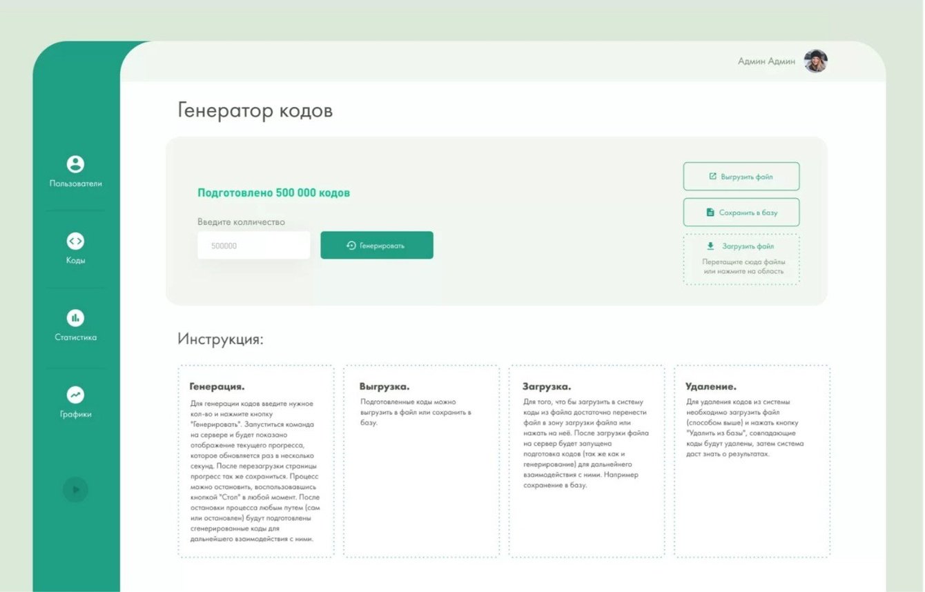 - Для администраторов системы с расширенным функционалом по генерации кодов.