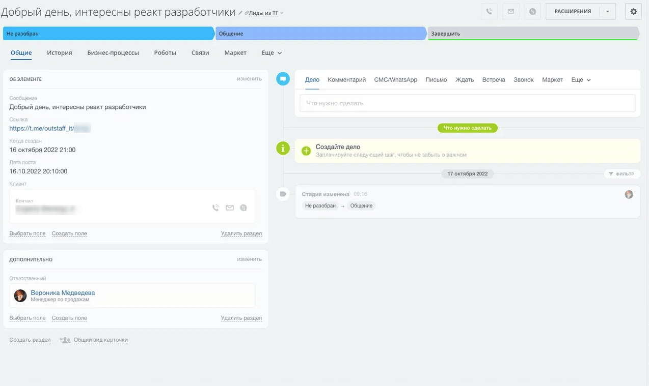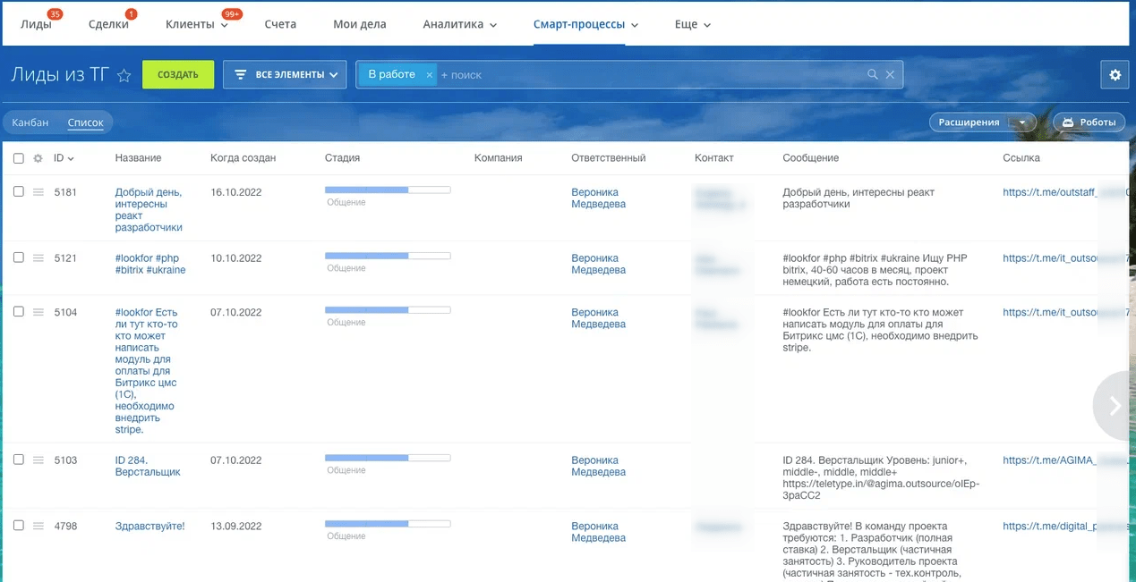 2. Обработка лидов: Когда модуль находит сообщение, соответствующее заданным условиям, оно автоматически преобразуется в лид. В CRM Битрикс24 передается само сообщение, ссылка на него в чате и ссылка на профиль автора в Телеграме.