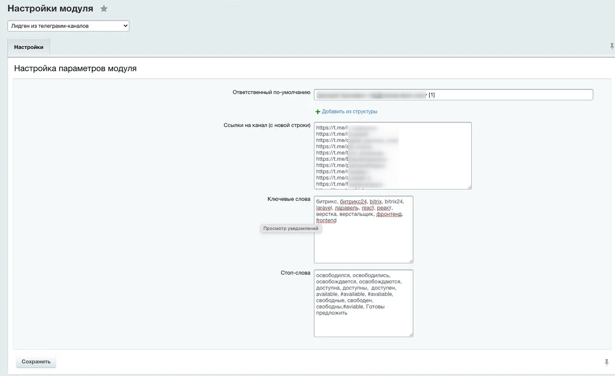 Модуль обращается по заданным ссылкам и извлекает нужные данные из сообщений. Все теги и эмодзи удаляются из текста, чтобы обеспечить более точный анализ и удобное отображение информации в Битрикс24.