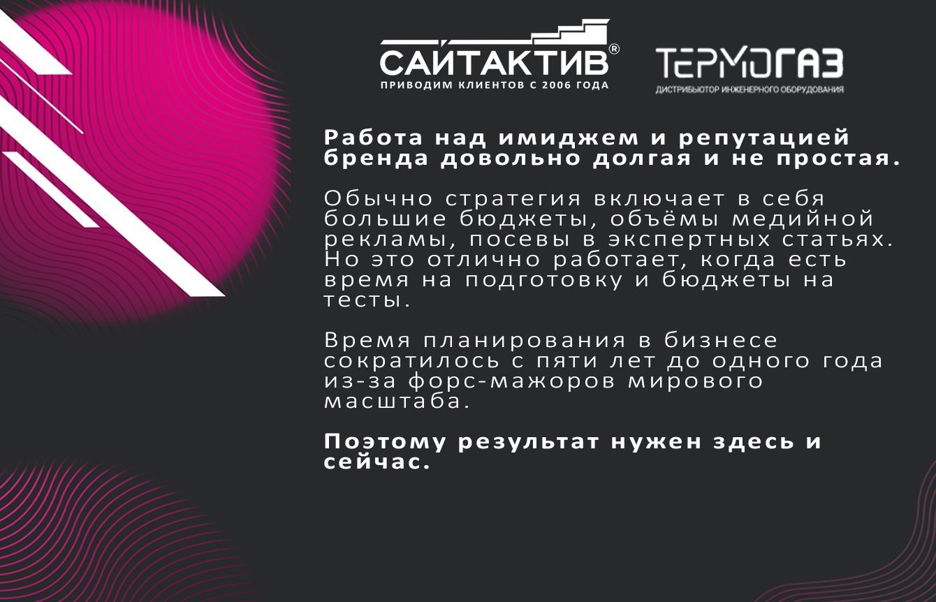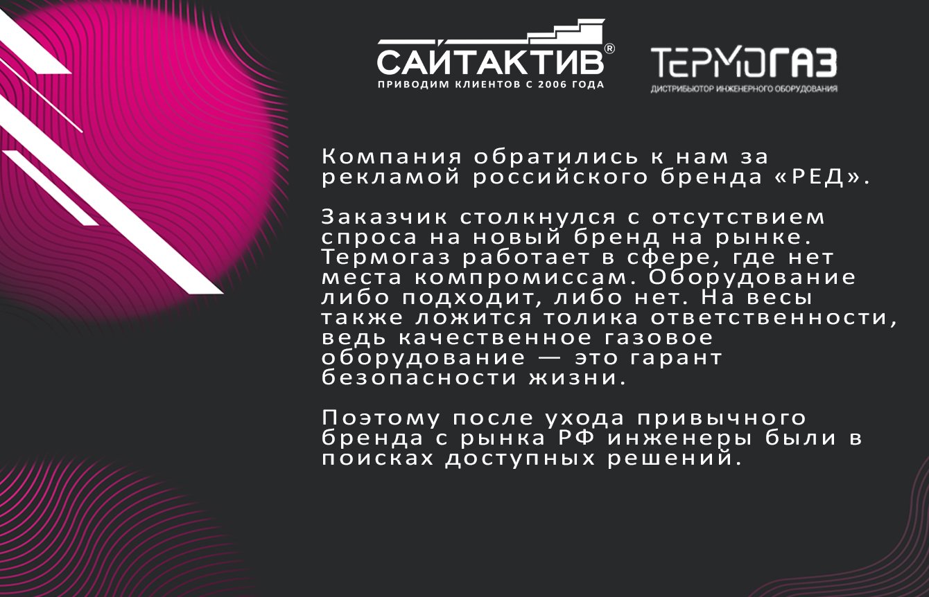 Компания обратились к нам за рекламой российского бренда «РЕД». Заказчик столкнулся с отсутствием спроса на новый бренд на рынке. Заказчик работает в сфере, где нет места компромиссам. Оборудование либо подходит, либо нет. На весы также ложится толика ответственности, ведь качественное газовое оборудование — это гарант безопасности жизни.
