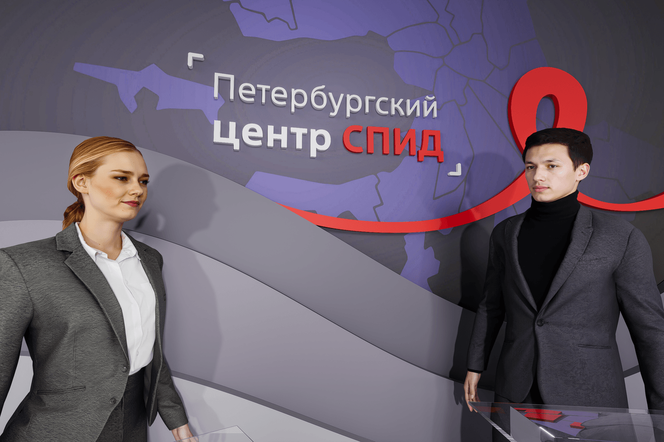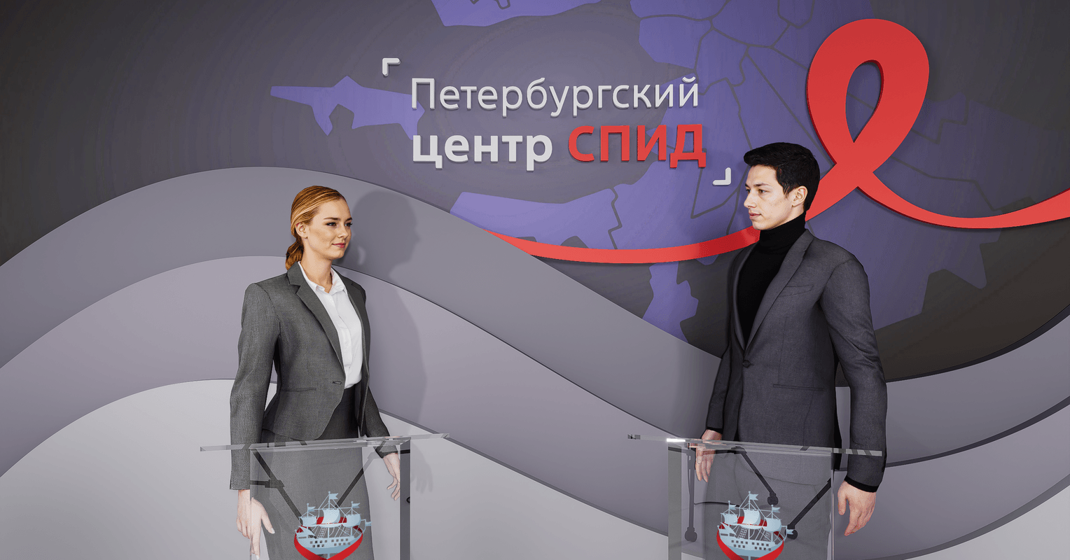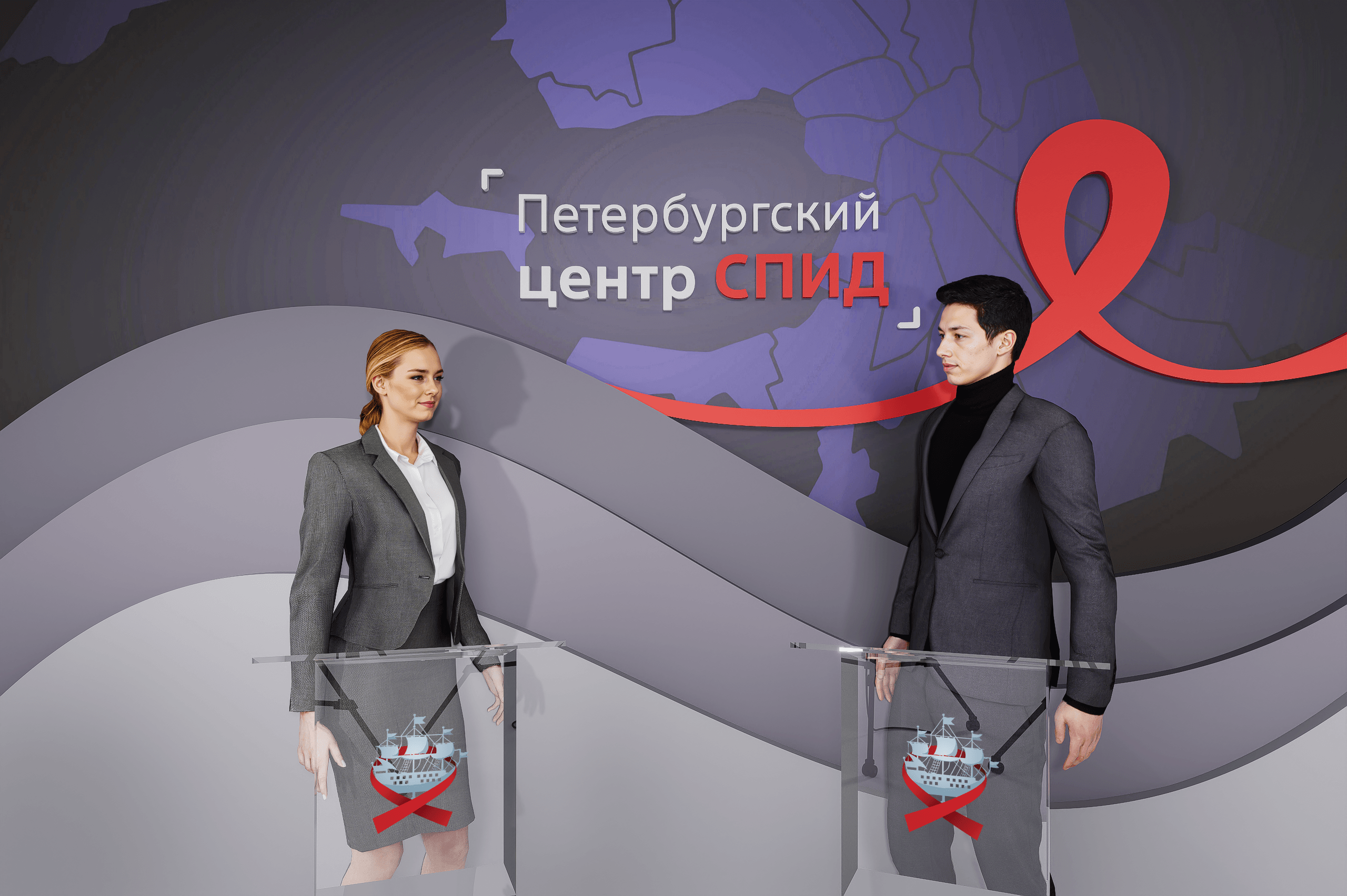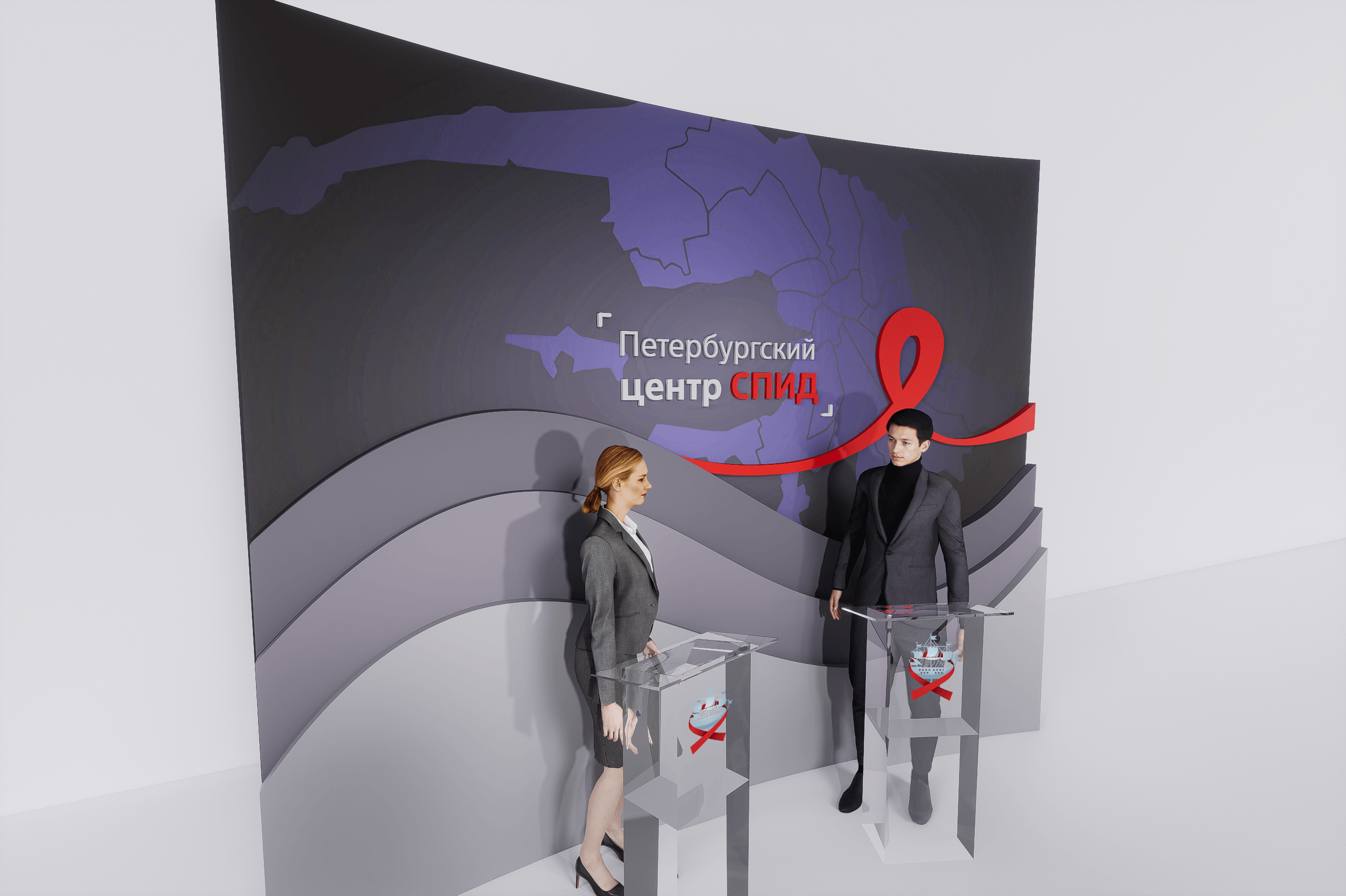 Создание привлекательного и функционального стенда для небольшой телевизионной студии, где будут проходить обсуждения и интервью на тему борьбы с ВИЧ-инфекцией. Стенд должен отражать серьезность медицинской тематики, а также быть гостеприимным и удобным для ведущего и гостей.