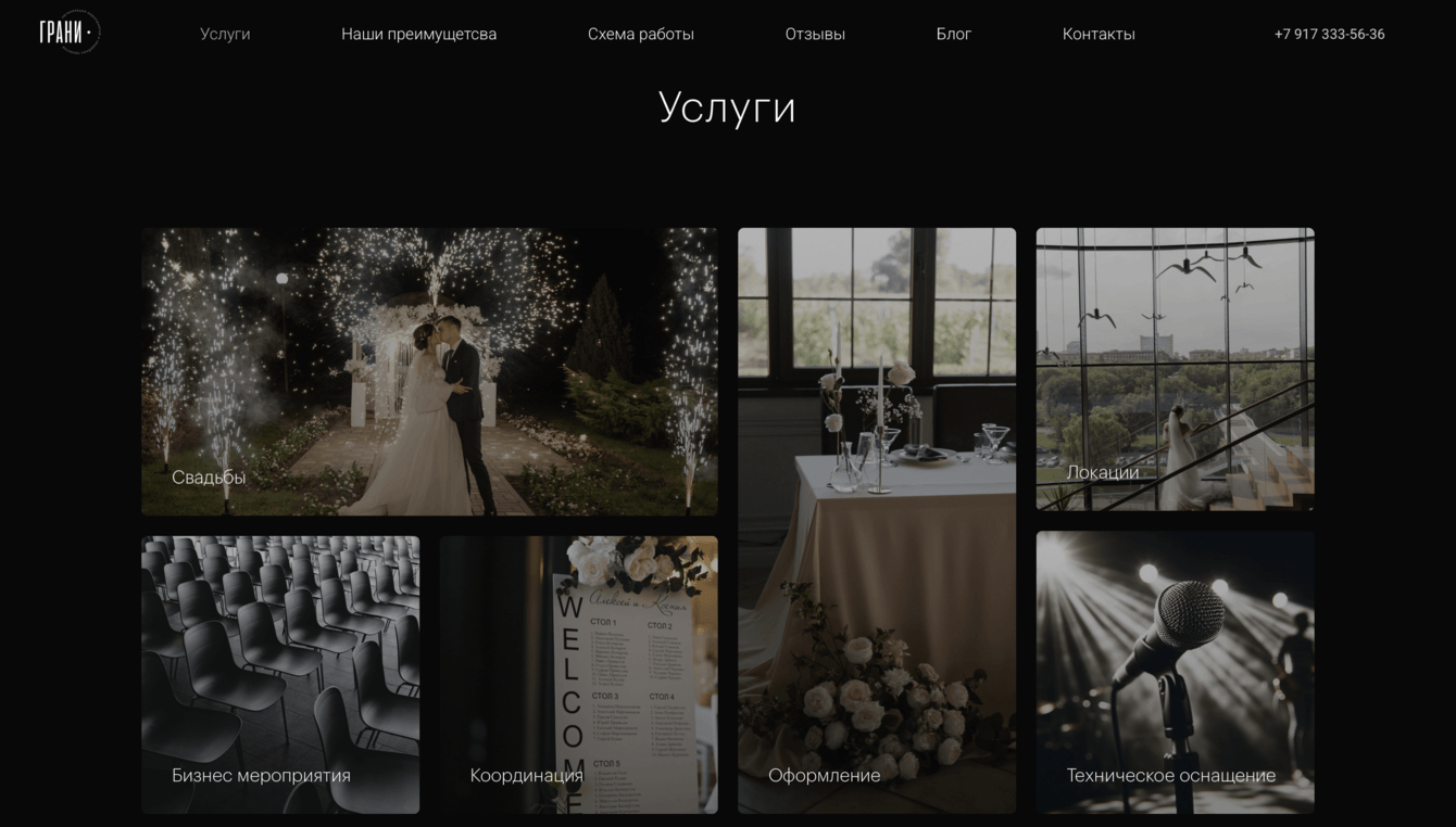 Агентство Grani обратилось к нам с запросом на создание современного, удобного и эстетически привлекательного сайта, который отразит их профессионализм в организации мероприятий. Важно было продемонстрировать услуги, преимущества, отзывы клиентов и схему работы, сохранив при этом легкость восприятия и интуитивную навигацию. Дополнительно требовалась адаптивность для мобильных устройств и SEO-оптимизация для привлечения новой аудитории.
