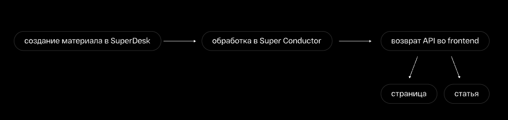 Материал создаётся в SuperDesk. Далее он переходит в приложение API (Super Conductor), обрабатывается и превращается в специальный объект. Возвращается в качестве API во frontend, и там уже преобразуется либо в страницу, либо в статью.