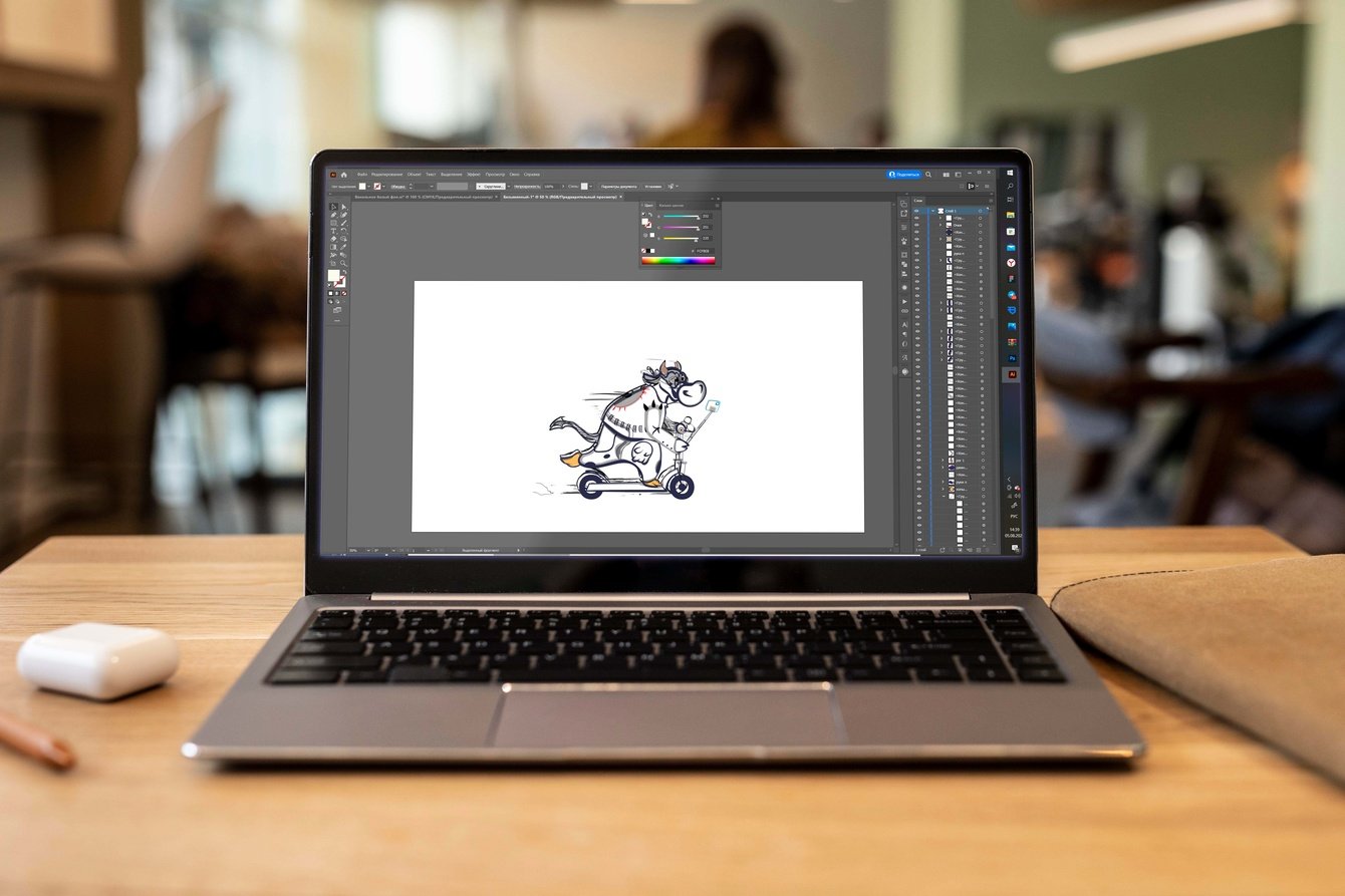 Коровка нам нужна шкодная, с характером. Чтобы отразить это, мы решили посадить ее на самокат, летящий по сливкам.