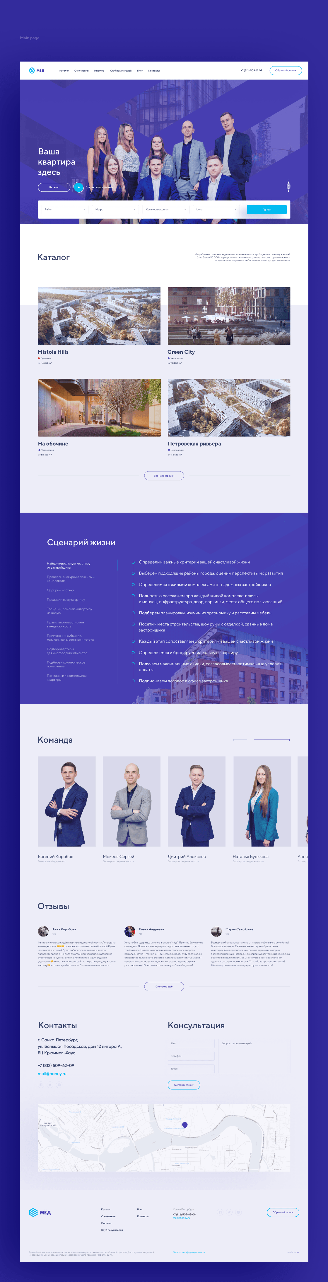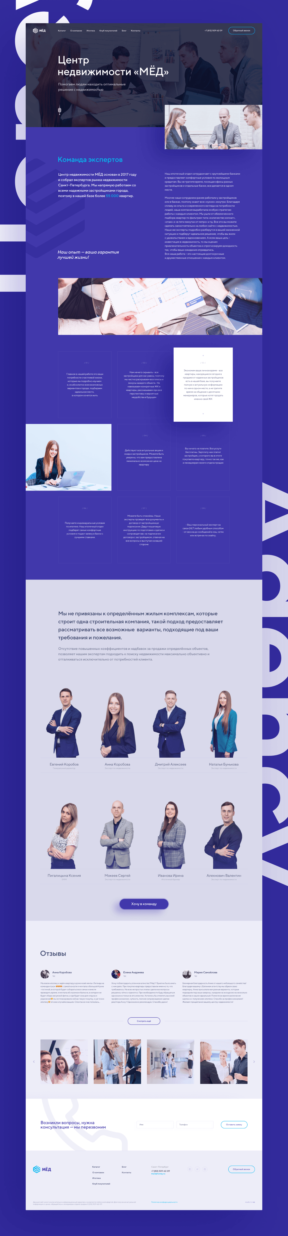 Также визуально изобразили “сценарий жизни” клиента — путь, по которому он пройдет в агентстве. А чтобы вызвать доверие у посетителей, ниже разместили фотографии сотрудников “МЁДа” и отзывы клиентов с ссылками на их соцсети. Так любой может проверить подлинность отзыва, написав его автору лично.