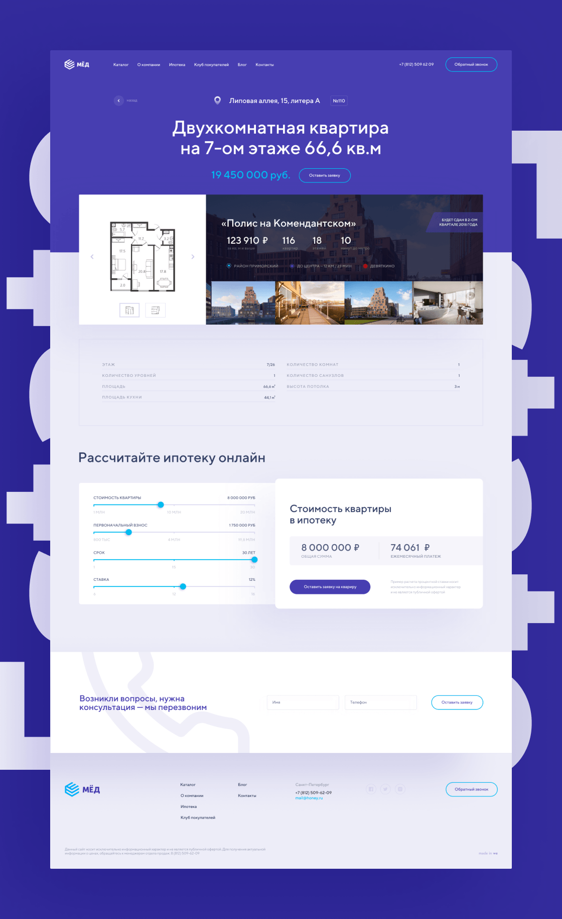 “МЁД” напрямую работает с проверенными застройщиками, что позволяет им предлагать клиентам выбор из более чем 55000 объектов недвижимости. В агентстве есть собственный ипотечный отдел, у которого налажено сотрудничество с несколькими банками. Поэтому в “МЁД” готовы предоставить клиентам выгодные условия кредита на жилье.