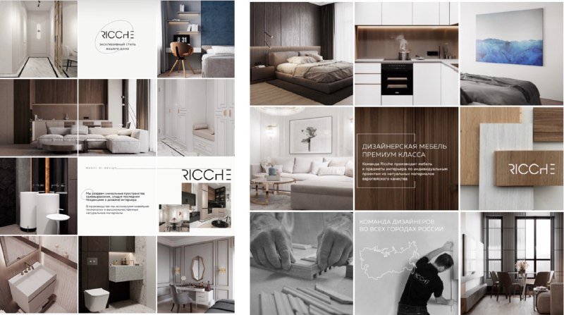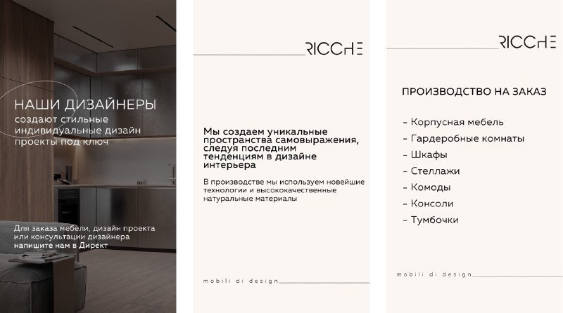Необходимо было разработать визуал для компании, занимающейся производством эксклюзивной мебели, а также разработкой и реализацией дизайн-проектов под ключ.