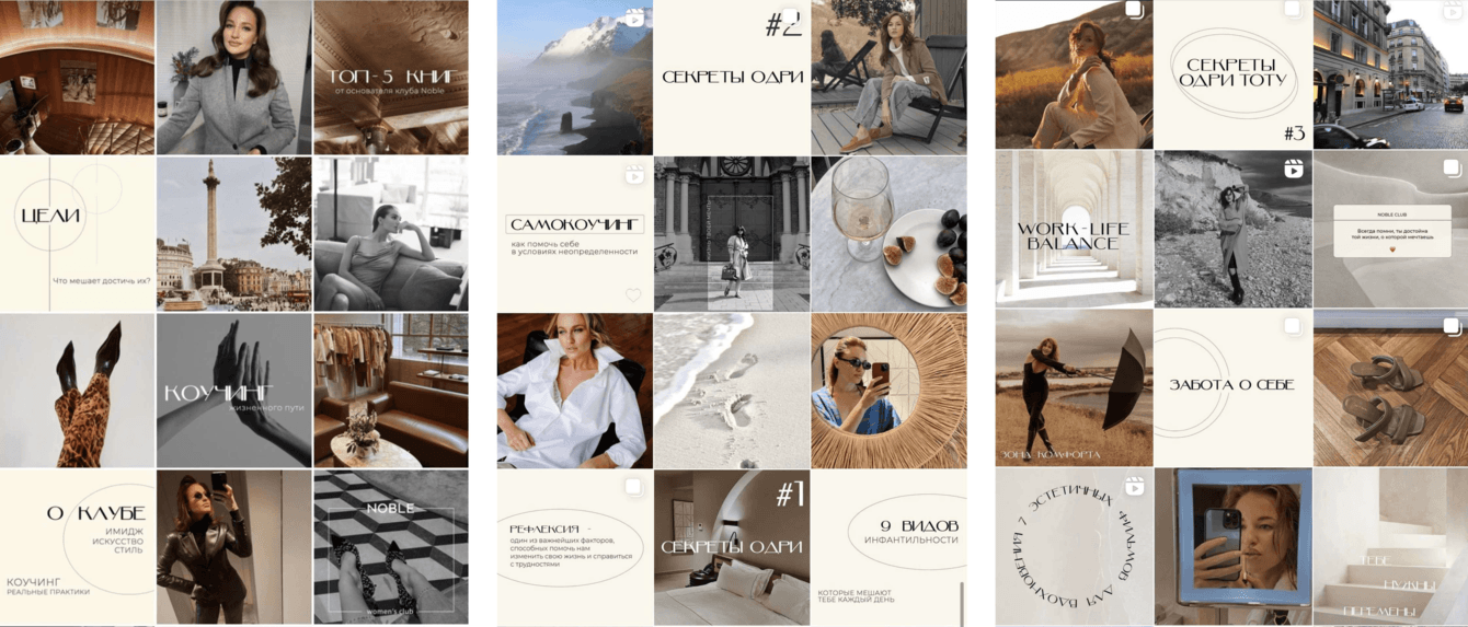 Необходимо было создать визуал ленты в Instagram и промо-макеты для продвижения женского клуба Noble, основанного коучем Ксенией Стрекач. Главной задачей было показать разноплановость тематики (красота, стиль, искусство), не отходя от коучинга и психологии.