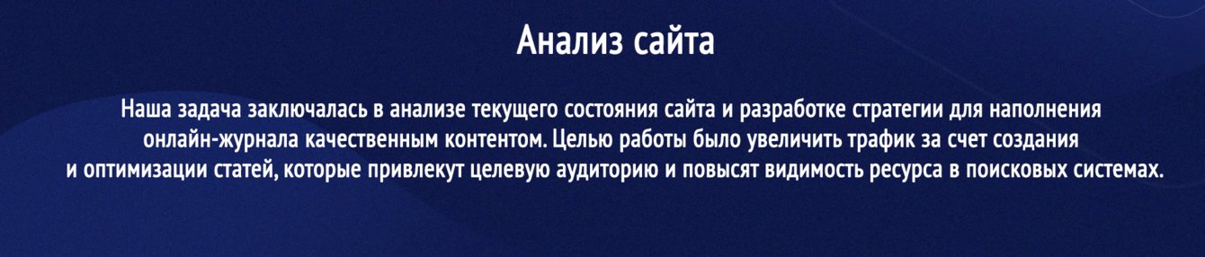 Начали активно наполнять журнал качественным контентом, ориентированным на потребности нашей аудитории. Каждый материал был тщательно оптимизирован под SEO, чтобы не только привлечь внимание пользователей, но и повысить позиции в поисковых системах. Такой подход позволил создать ценный ресурс, который отвечает на вопросы аудитории и способствует росту трафика.