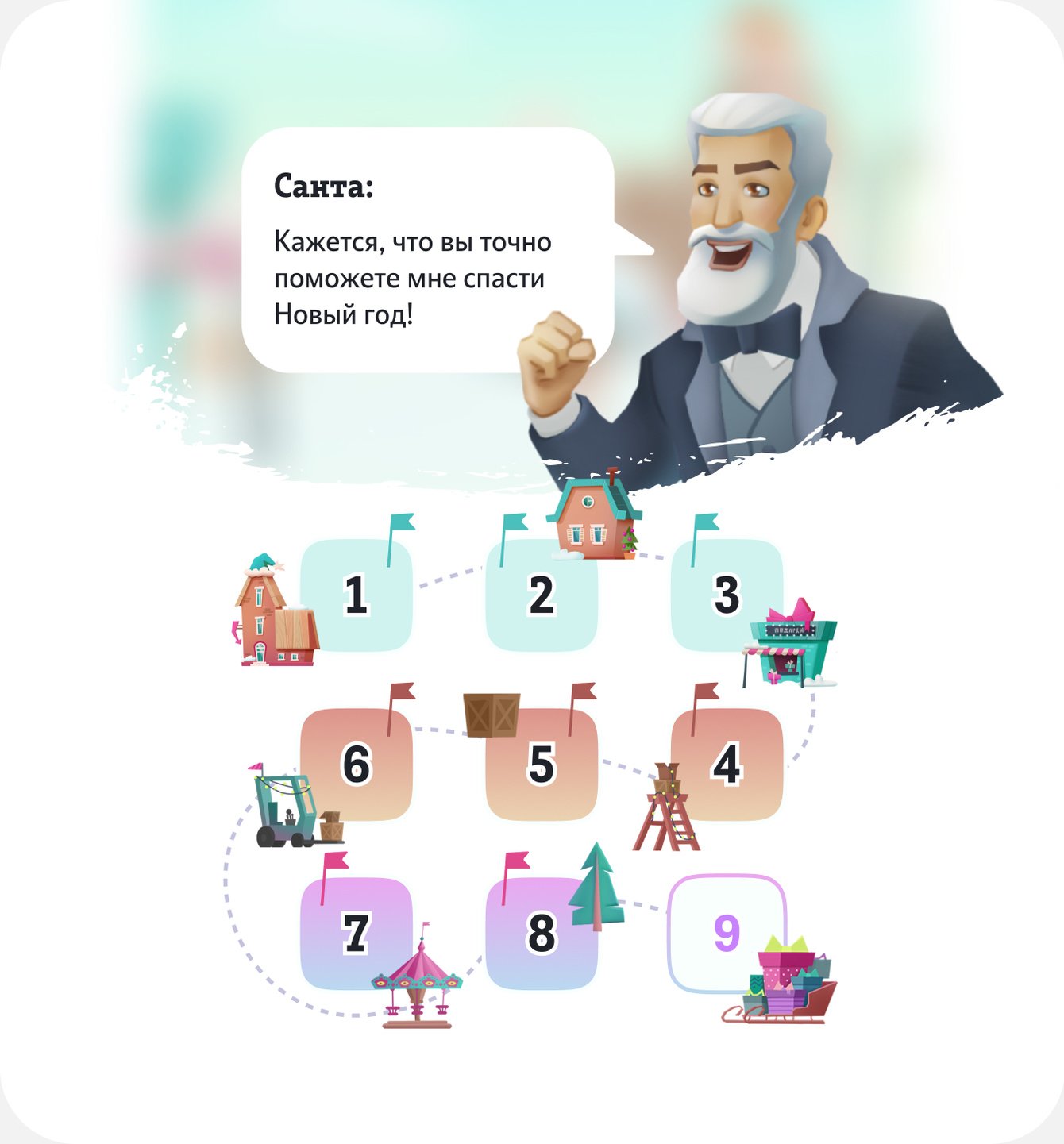 Мы спроектировали игровую карту из 9 локаций с постепенным усложнением уровней. Каждая локация – это испытание, где пользователь играет в снежный бой со снеговиками и зарабатывает баллы.