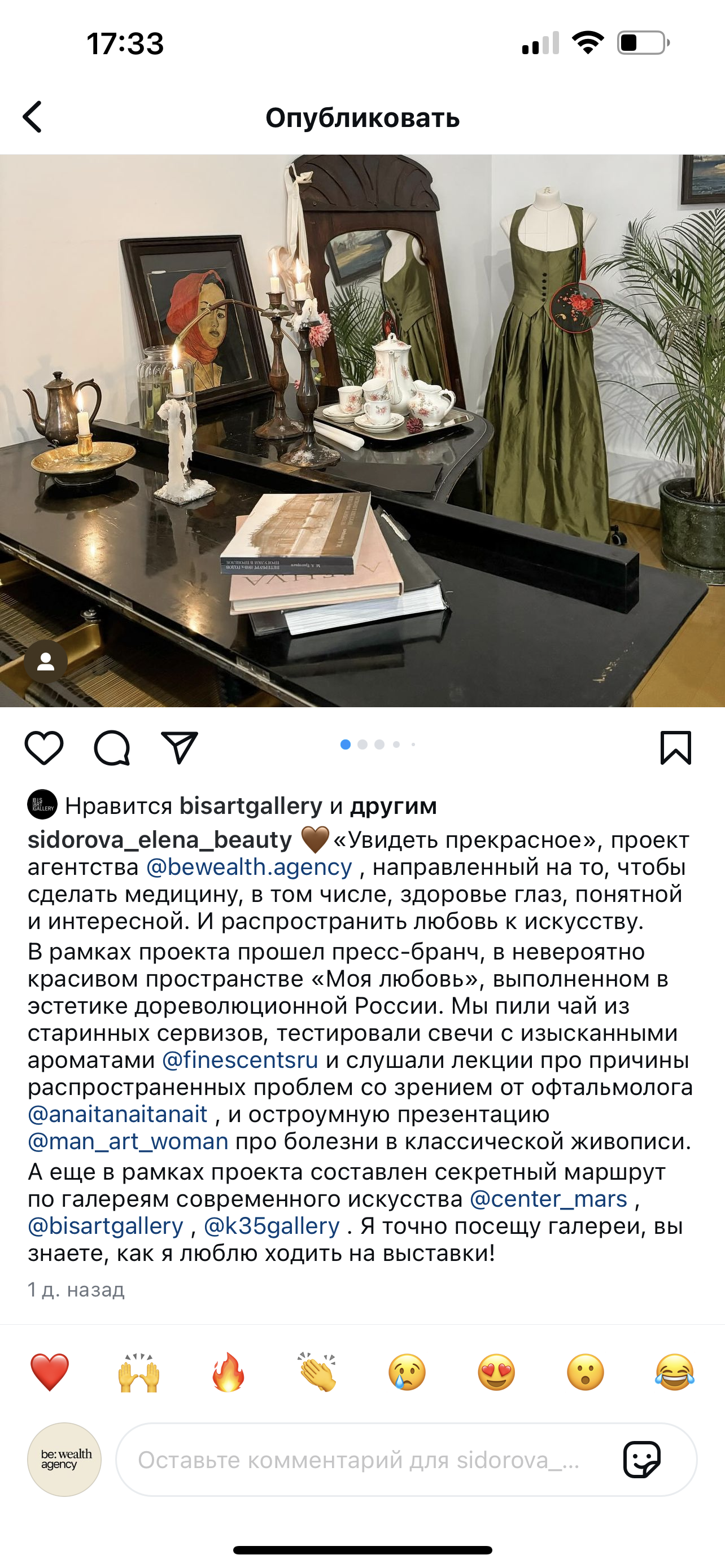 Реализован спецпроект агентства be:wealth agency, посвященный ценности зрения, благодаря которому мы можем воспринимать прекрасное. В рамках проекта создан маршрут по галереям современного искусства. В поддержку запуска проекта проведен пресс-бранч.