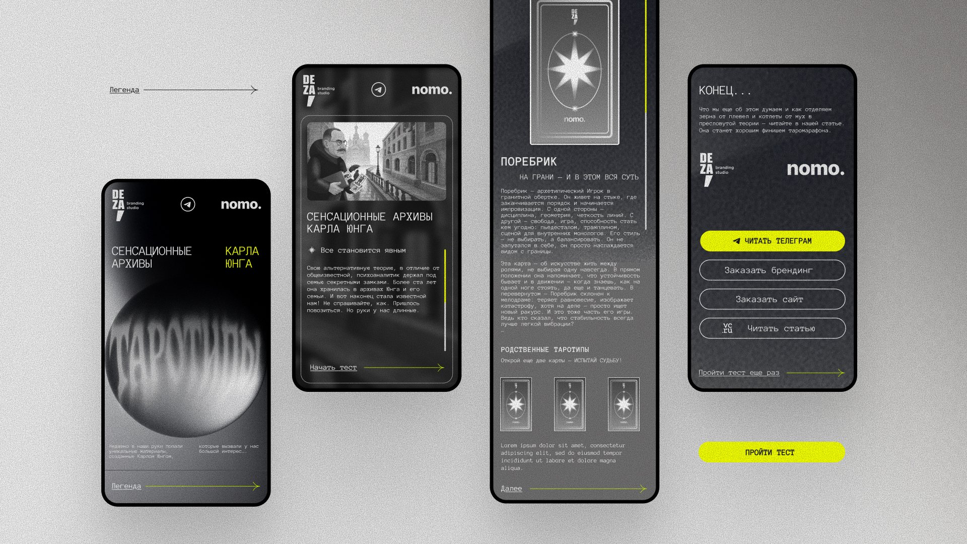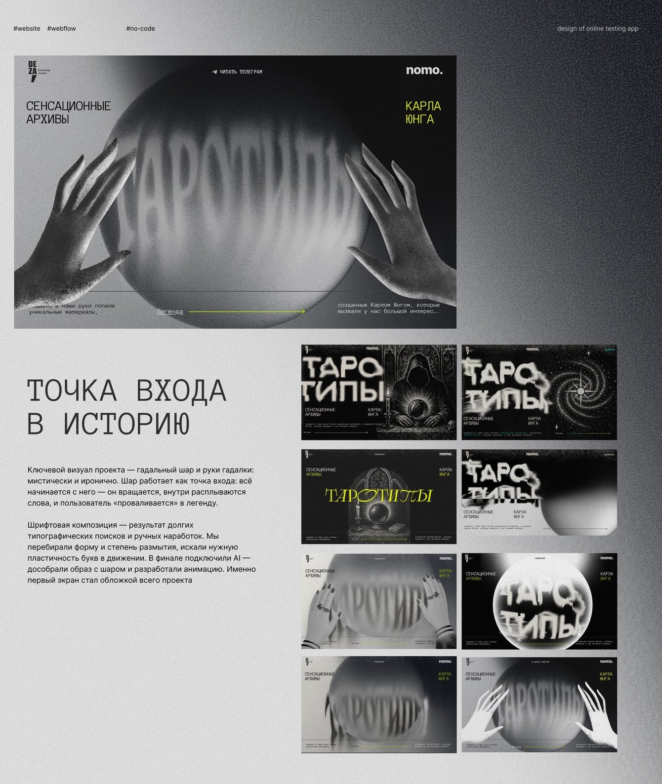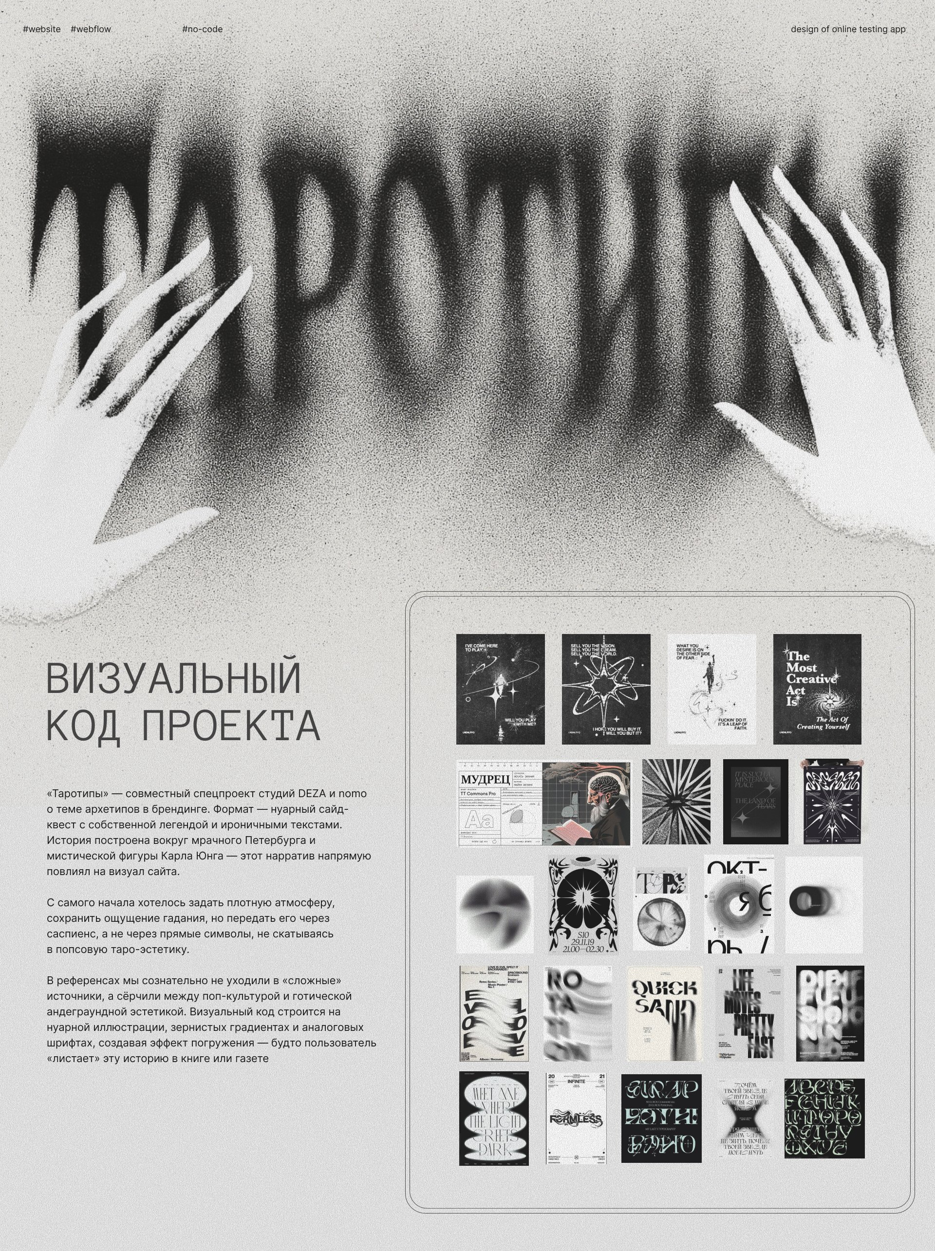 «Таротипы» — спецпроект студий Deza и nomo, посвящённый теме архетипов в брендинге. Это ироничный нуарный сайт-квест с собственной легендой, персонажами и «системой типирования», вдохновлённой юнгианством. В основе сюжета — вымышленная история о Карле Юнге в мрачных петербургских декорациях и шуточный тест-гадание на таротипы — ироничная параллель с архетипированием в брендинге.