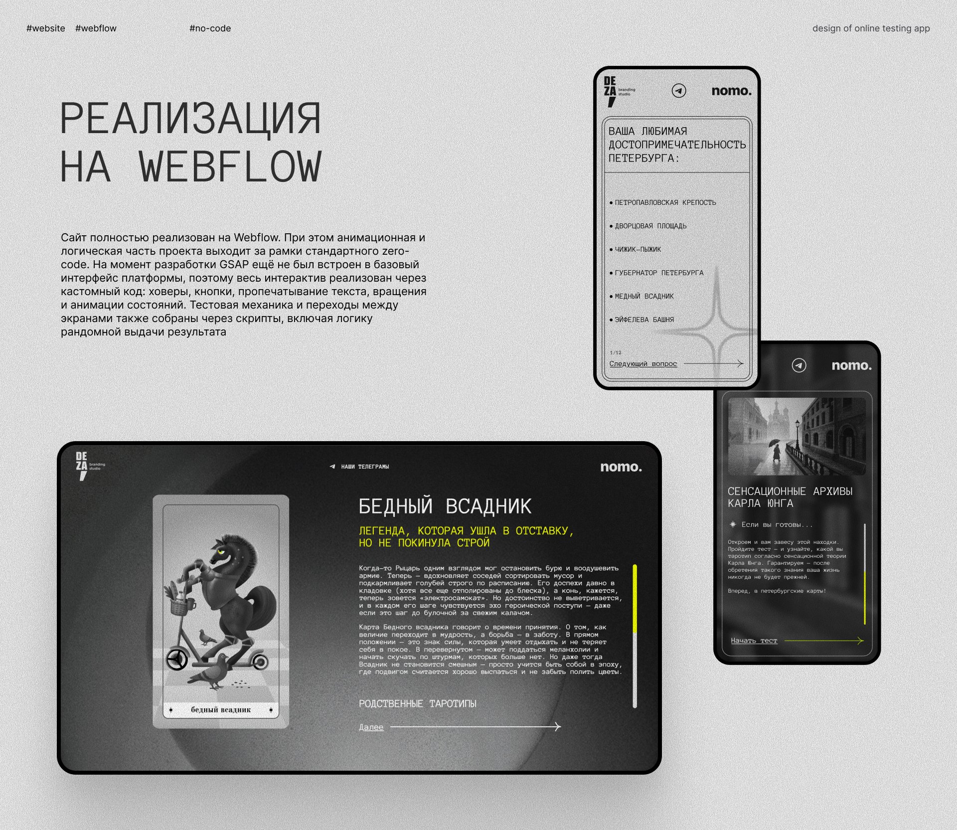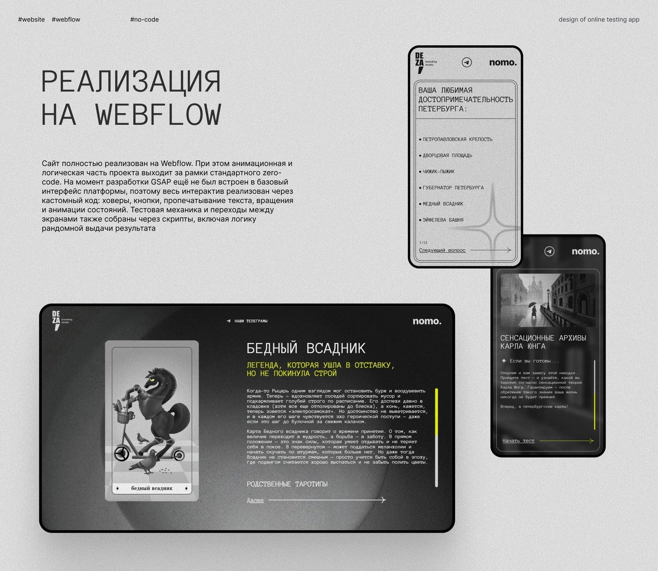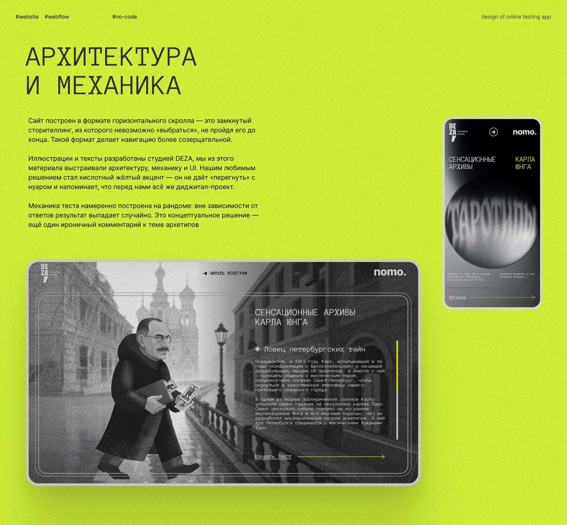 «Таротипы» — спецпроект студий Deza и nomo, посвящённый теме архетипов в брендинге. Это ироничный нуарный сайт-квест с собственной легендой, персонажами и «системой типирования», вдохновлённой юнгианством. В основе сюжета — вымышленная история о Карле Юнге в мрачных петербургских декорациях и шуточный тест-гадание на таротипы — ироничная параллель с архетипированием в брендинге.