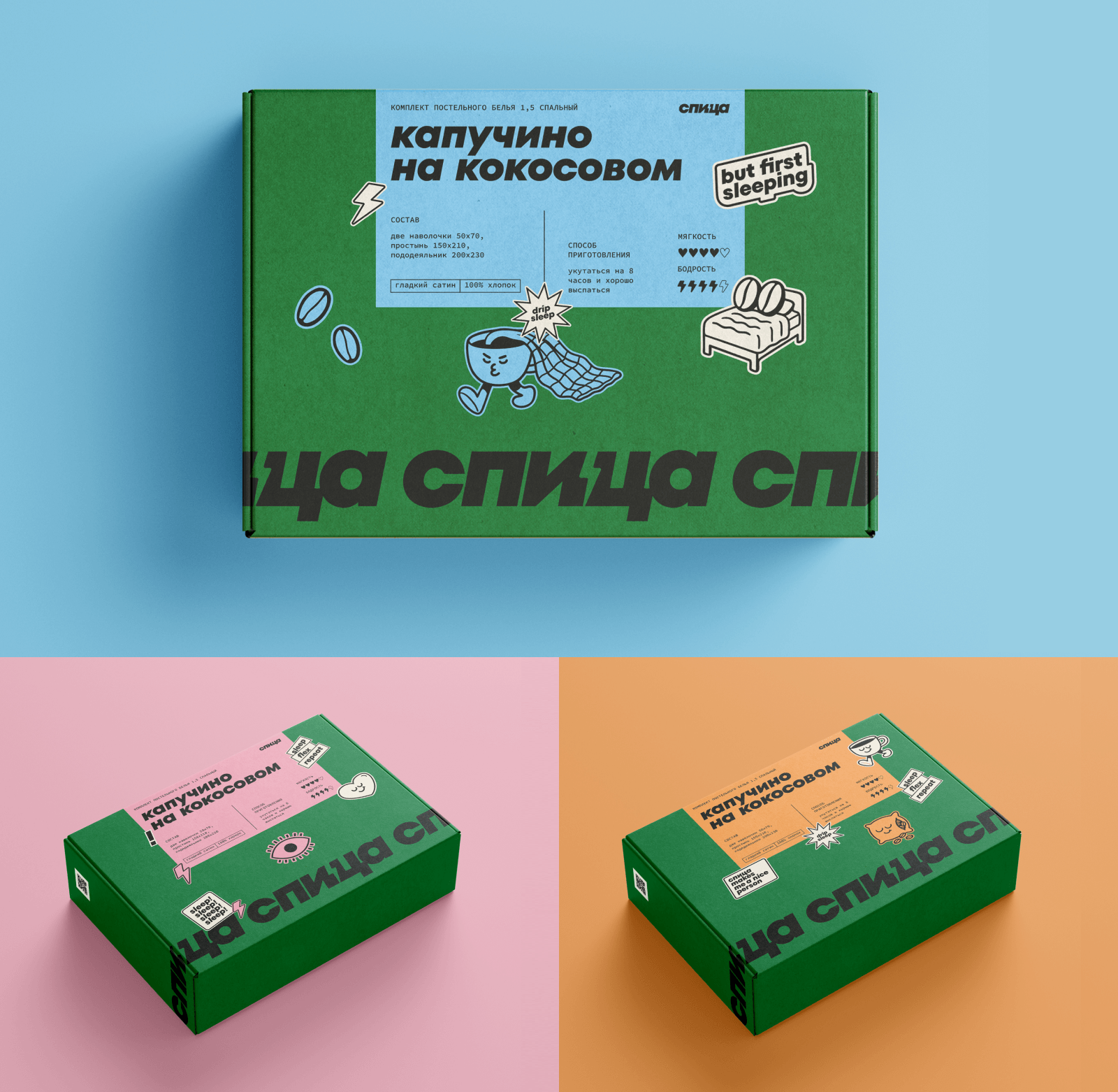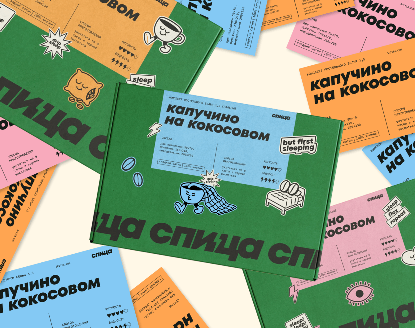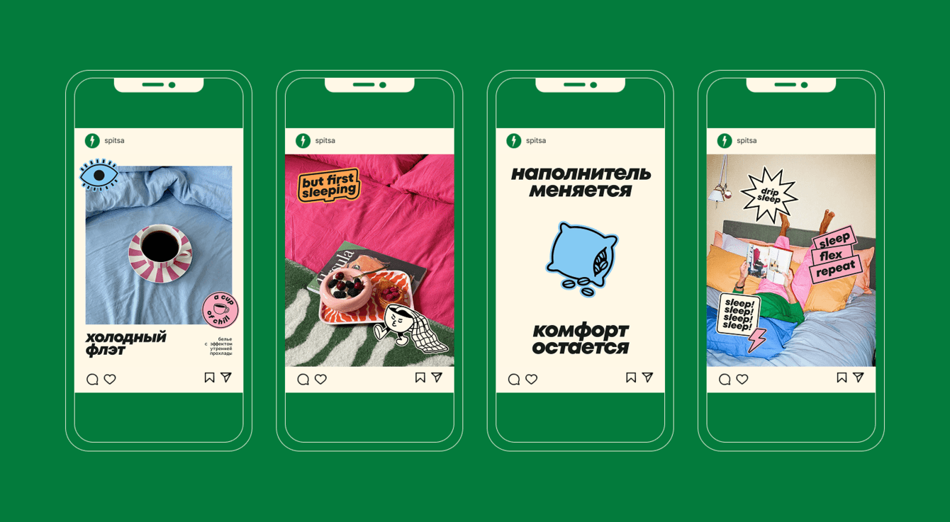 Так мы придумали называть комплекты постельного белья по аналогии с модными кофейно-чайными напитками — матча-латте, малиновый раф или капучино на кокосовом; а ещё заложили целую систему стикеров, которая обыгрывает популярные «миллениальские» фразы о любви к кофе. Мы просто заменили сoffee на спица и получили целую кучу креативов: