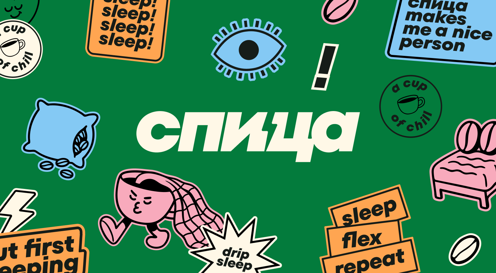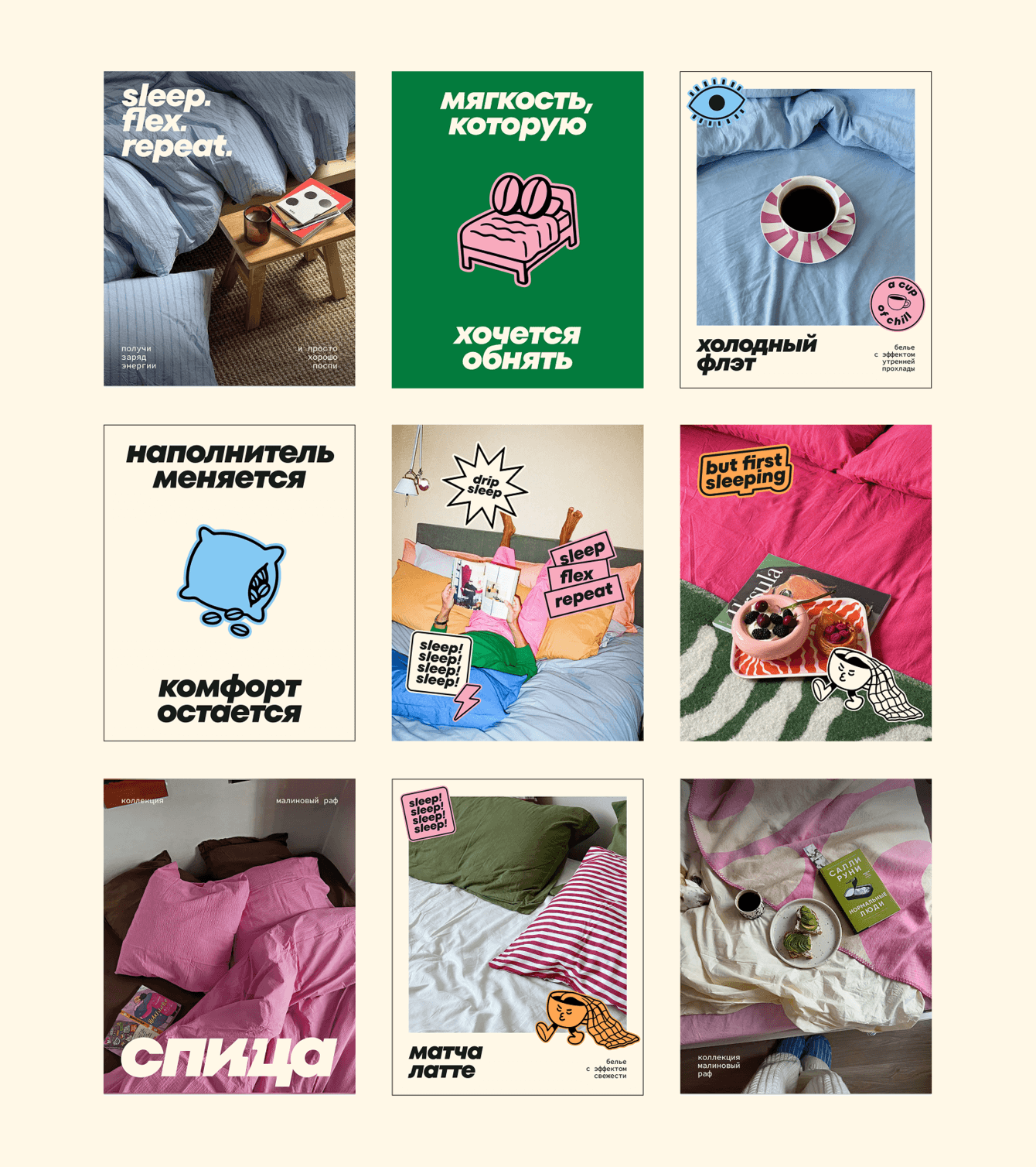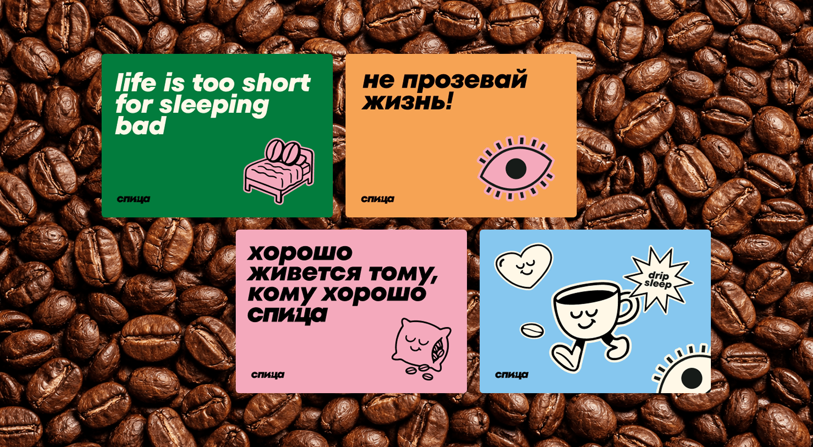 Так мы придумали называть комплекты постельного белья по аналогии с модными кофейно-чайными напитками — матча-латте, малиновый раф или капучино на кокосовом; а ещё заложили целую систему стикеров, которая обыгрывает популярные «миллениальские» фразы о любви к кофе. Мы просто заменили сoffee на спица и получили целую кучу креативов: